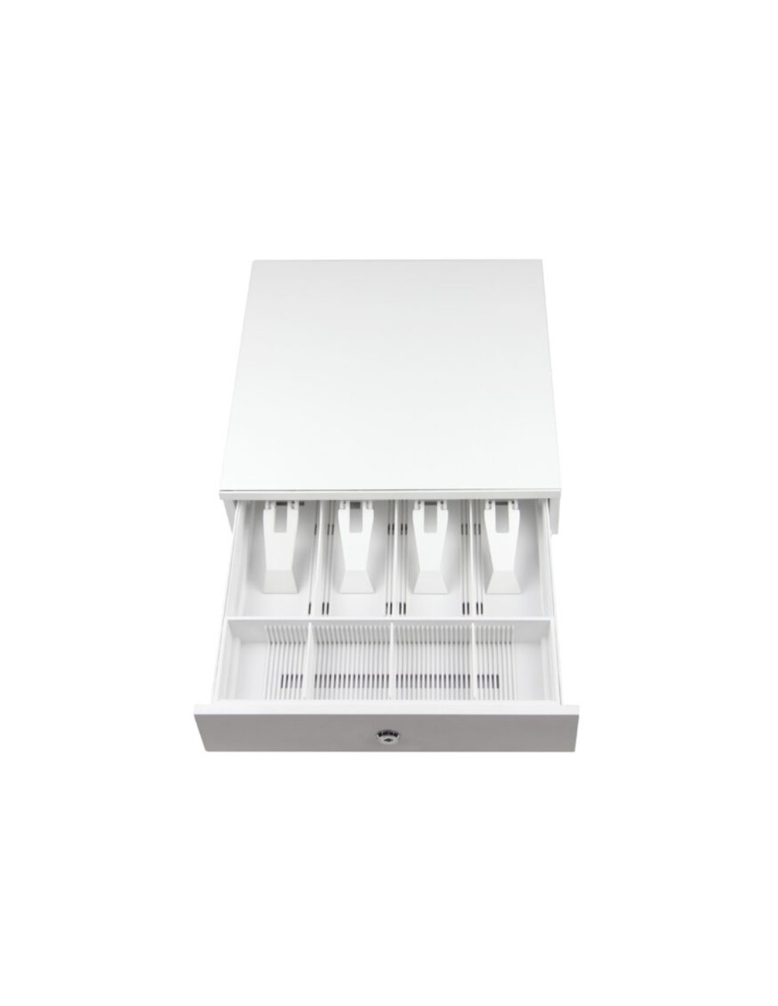 Avec tiroir-caisse amovible et pinces à billets en métal. Compatible avec toute imprimante de tickets dotée d'une connexion RJ11.