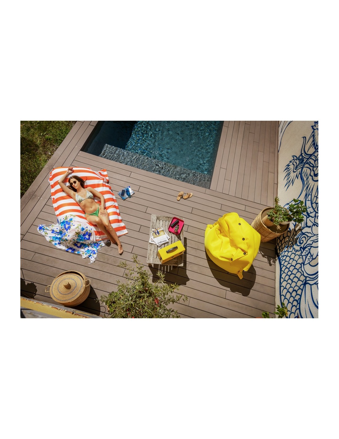 Le pouf Shelto s'adapte à tous vos besoins : salon cosy, jardin détente ou même sur l'eau ! Grâce à son tissu révolutionnaire en mesh alvéolaire, l'air et l'eau circulent librement, permettant une utilisation sans souci en extérieur et sur une piscine.