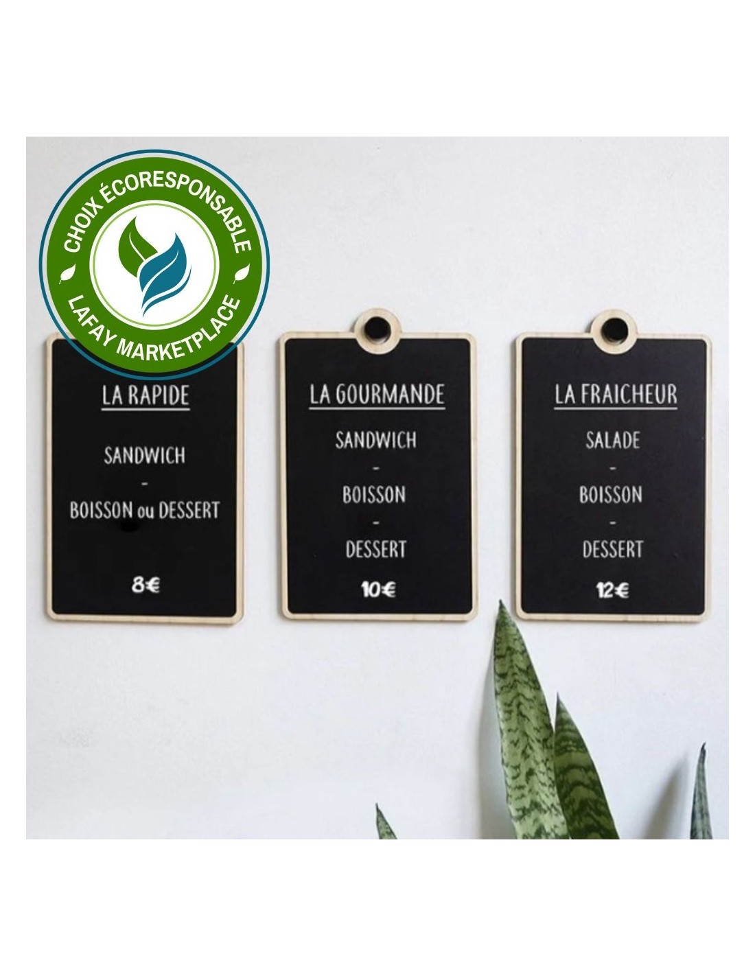 Affichez vos messages, menus ou infos du jour avec flexibilité et style grâce à cette ardoise accompagnée de 3 tablettes en bois massif. Un combo parfait pour les pros qui aiment pouvoir s’adapter : changer un prix, mettre un message perso ou afficher un menu du midi n’a jamais été aussi simple… et aussi beau.