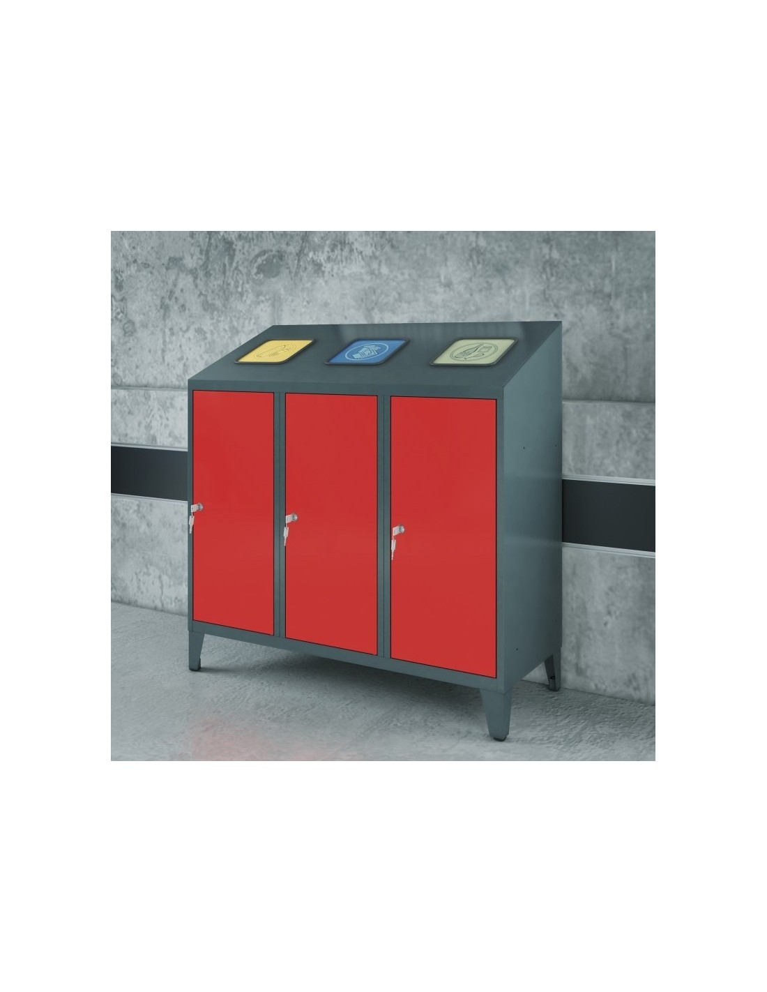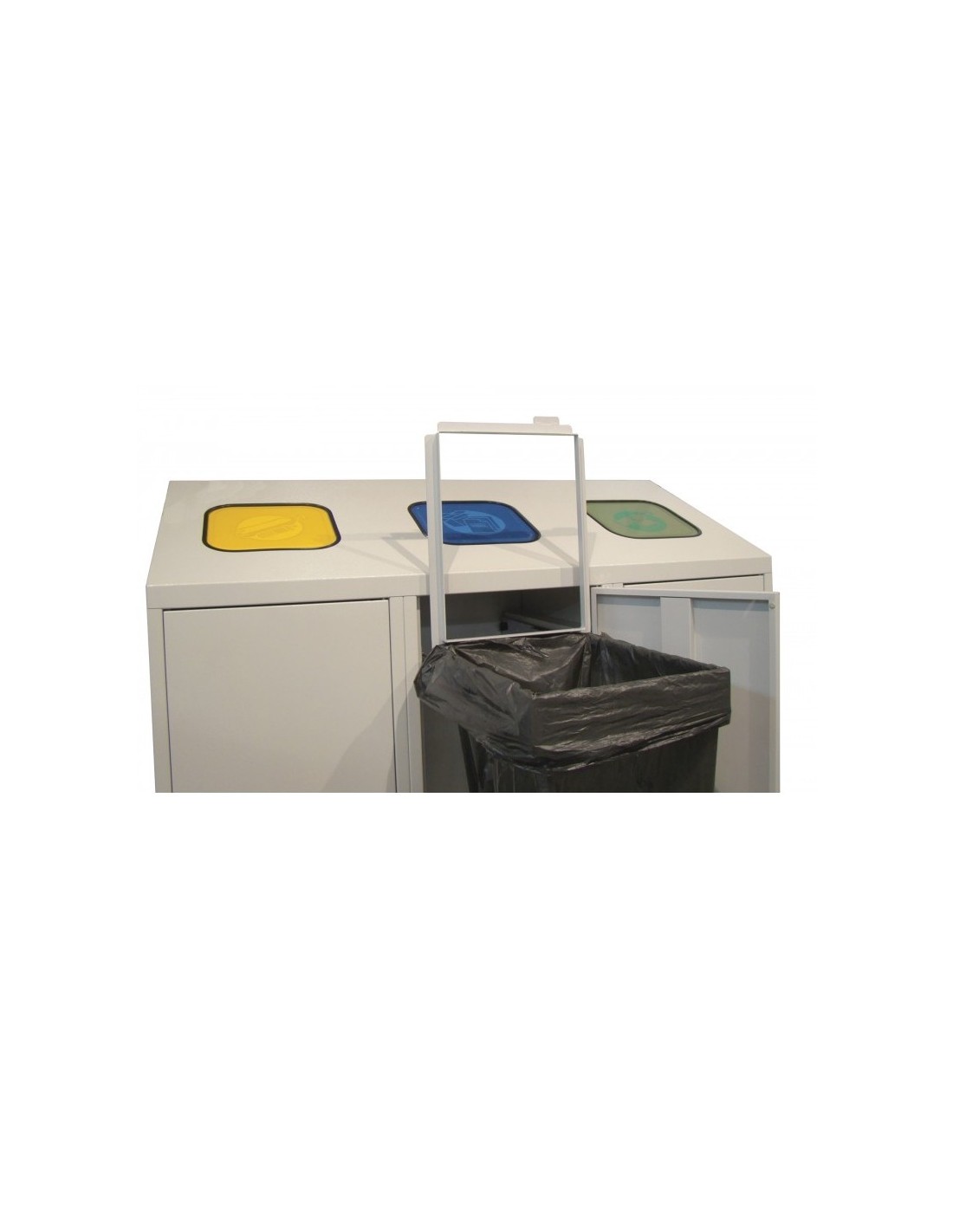 Fabriquée en tôle d'acier robuste et équipée de couvercles colorés pour faciliter l'identification des déchets, elle permet une gestion efficace et hygiénique des déchets recyclables. Grâce à son design épuré et sa modularité, elle s’intègre parfaitement à tous les environnements intérieurs.