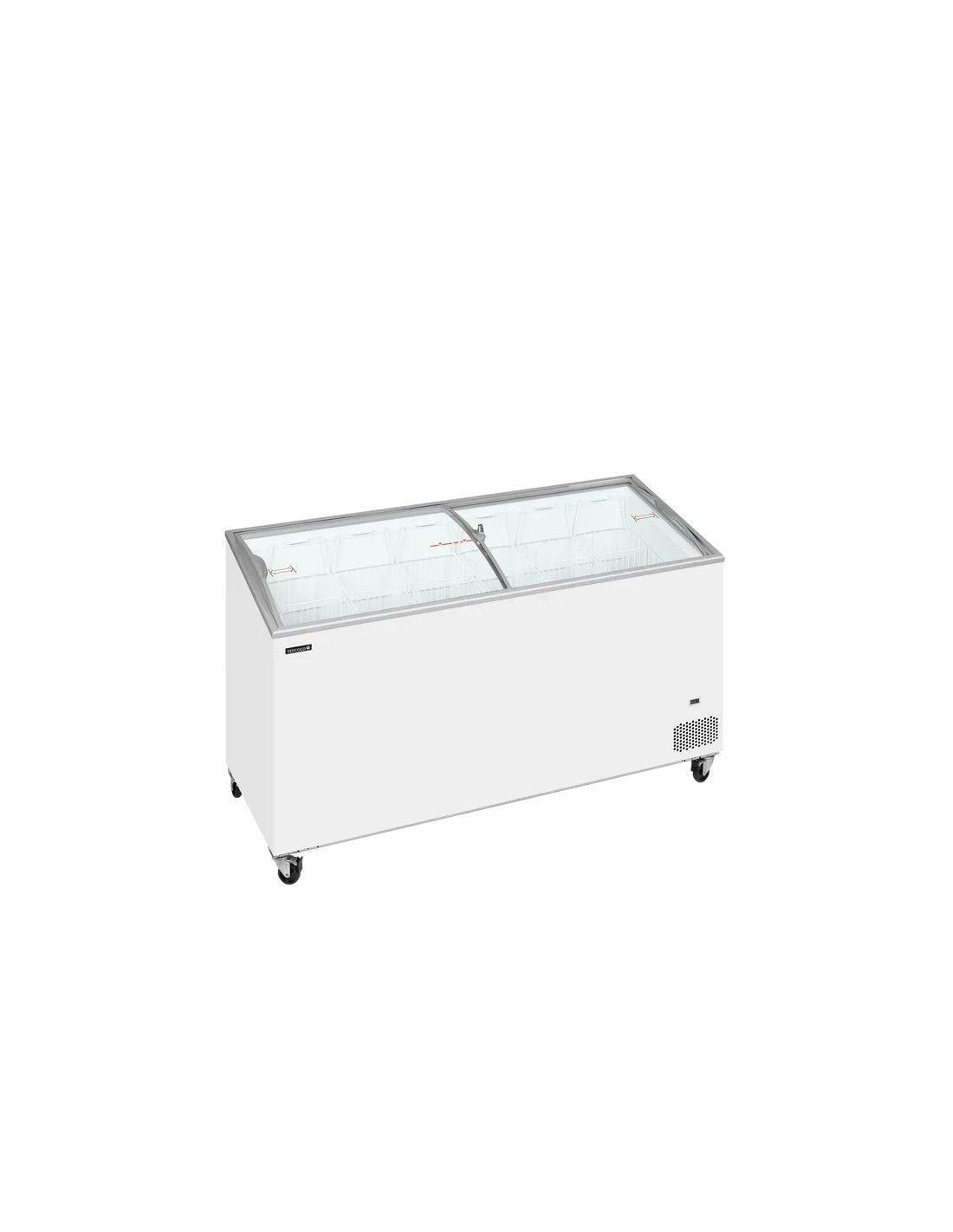 Comprend un ensemble complet de paniers Couvercles incurvés coulissants avec verrou Thermomètre Revêtement interne laqué blanc Roulettes avec freins température -24 à -14 °C Classe climatique 5 Poids brut / net 85 / 72 kg Volume brut / net 427 / 398 l Design et matériaux Nombre et type de couvercles 2 couvercles coulissants incurvés verre trempé Nombre et type de paniers 6 Paniers métalliques, blancs Vitrage de sécurité Oui Roulettes 4 roulettes, 2 avec frein Finition extérieure Blanc Finition intérieure Acier peint en blanc Serrure Oui Froid et fonctions Type de régulation Mécanique Type de réfrigération Statique Type de dégivrage Manuel Fluide frigorigène R290 Charge de gaz 110 g Puissance et consommation Classe énergétique Consommation d'énergie 4.3 kWh/24h Consommation énergétique annuelle 1570 kWh/an Indice d’efficacité énergétique 74 Vol EEI 385 l Puissance consommée 191 W Tension / Fréquence 220-240/50 V/Hz Niveau sonore 45 db(A) Thermomètre Oui Dimensions Dimensions intérieures (LxPxH) 1420 x 495 x 710 mm Dimensions extérieures (LxPxH) 1550 x 615 x 949 mm Dimensions emballées (LxPxH) 1640 x 750 x 1010 mm