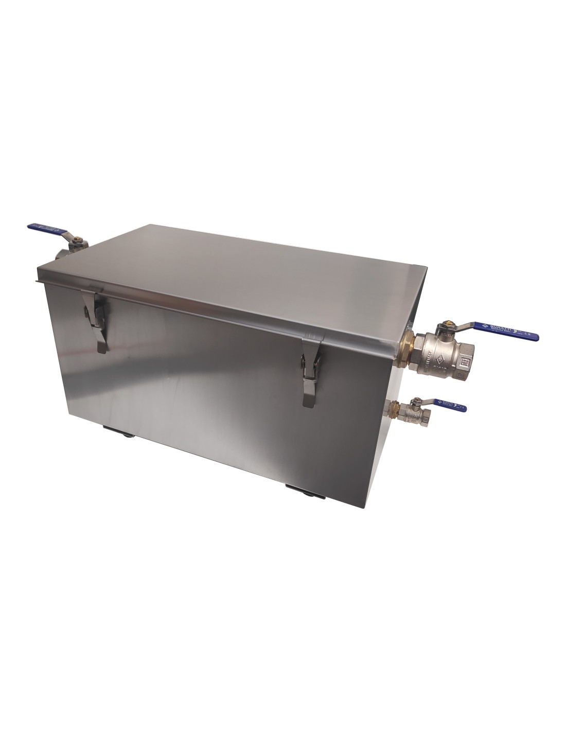 Bac réalisé en inox 304 (qualité alimentaire) Posé au sol et doté de vérins amovibles, sa hauteur peut être ajustée L’étanchéité du bac est garantie par une fermeture par grenouillère et 1 joint Fourni avec un panier à déchets amovible Dotation: deux vannes ¼ de tour 1’’1/2 et une vanne ¾’’