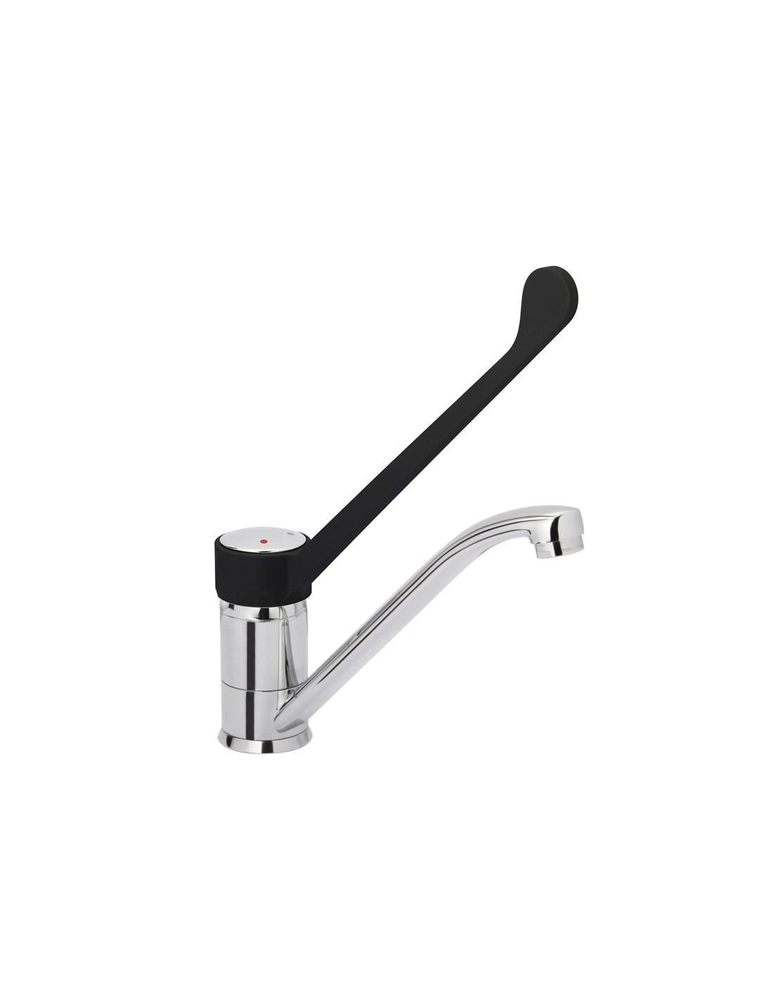 Long bec col de cygne L-215 +/- 5 mm orientable Levier clinique en plastique PA6 noir L- 214 mm pour commande au coude Mitigeur chromé monotrou Corps fabriqué en 1 partie Diamètre de perçage sur plan de travail : maximum diam. 32 mm Flexible L-400 mm Livré avec 2 flexibles inox embout femelle 3/8" Clapets anti-retour 3/8"