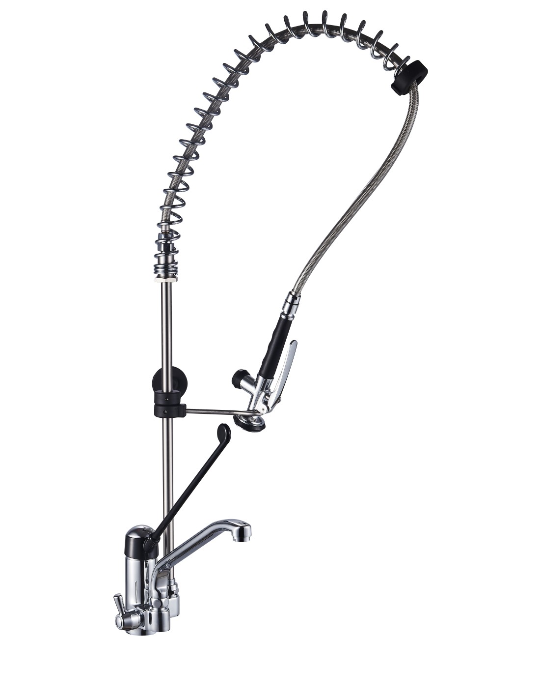 Modèle à poser sur plonge Long bec col de cygne orientable Levier clinique noir L-312 mm pour commande au coude Tuyau flexible longueur 1000mm Ressort en acier chromé et tube inox Poignée ergonomique Débit 7L/min à 3 bars