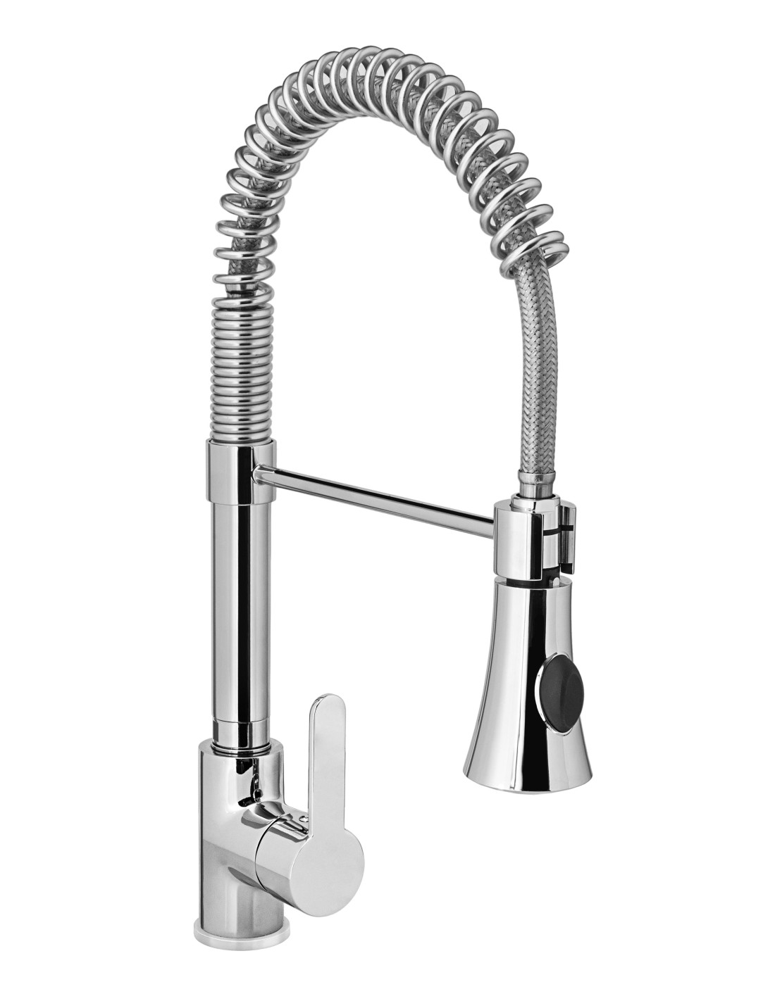 Modèle à poser sur plonge Long bec col de cygne orientable Levier clinique noir L-312 mm pour commande au coude Tuyau flexible longueur 1000mm Ressort en acier chromé et tube inox Poignée ergonomique Débit 7L/min à 3 bars