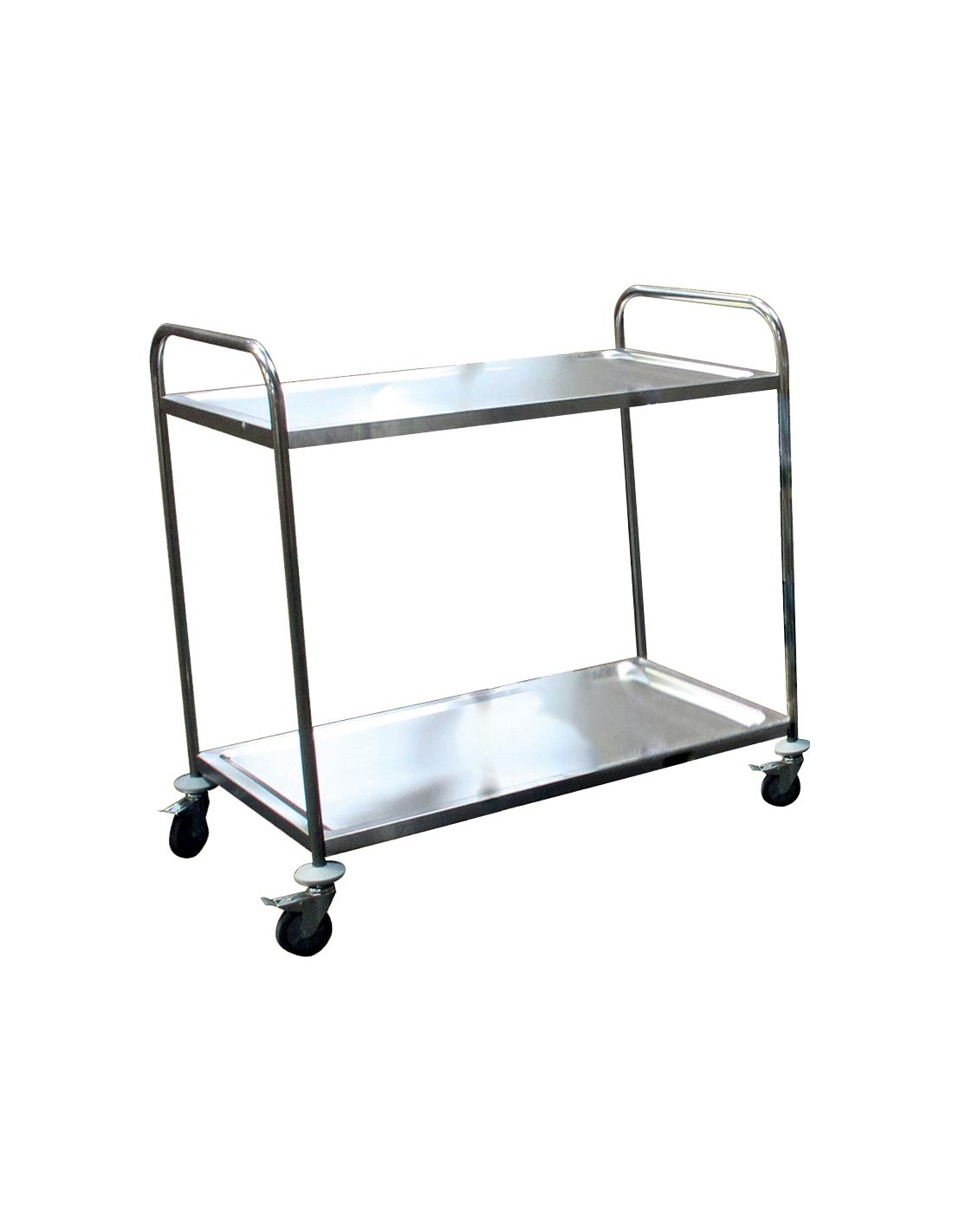 DESSERTE DEMONTABLE INOX 201, 2 NIVEAUX, 4 ROUES PIVOTANTES DONT 2 A FREINS LIVREE DEMONTEE CHARGE MAXI: 80 KG L (en mm) : 860 - P (en mm) : 540 H (en mm) : 940