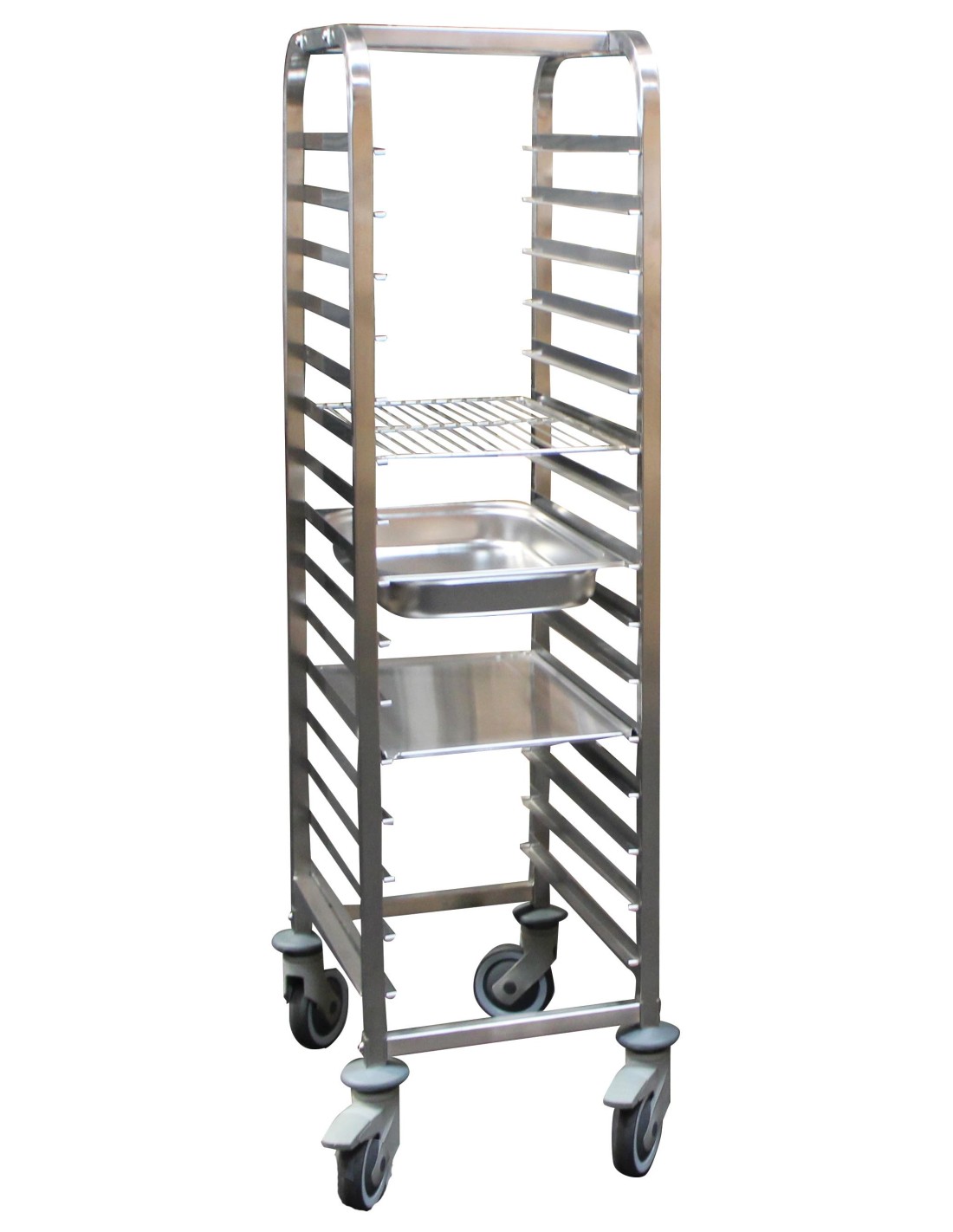 Construction inox, tubes 25x25 mm Glissères anti-chute avec butée 2 côtés 4 roulettes pivotantes ø 125 mm dont 2 freinées, chape polyamide avec parechocs Adaptée aux plateaux ABS et grilles 600x400 mm Livrée démontée