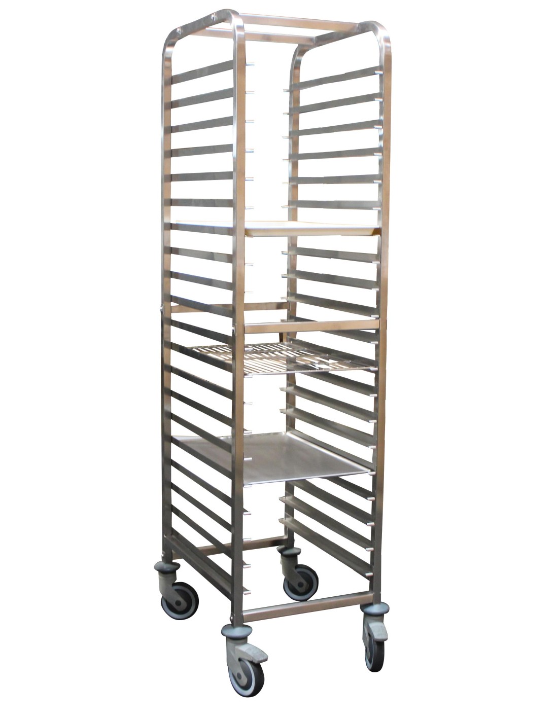 Construction inox, tubes 25x25 mm Glissères anti-chute avec butée 2 côtés 4 roulettes pivotantes ø 125 mm dont 2 freinées, chape polyamide avec parechocs Adaptée aux grilles et aux bacs gastros Livrée démontée