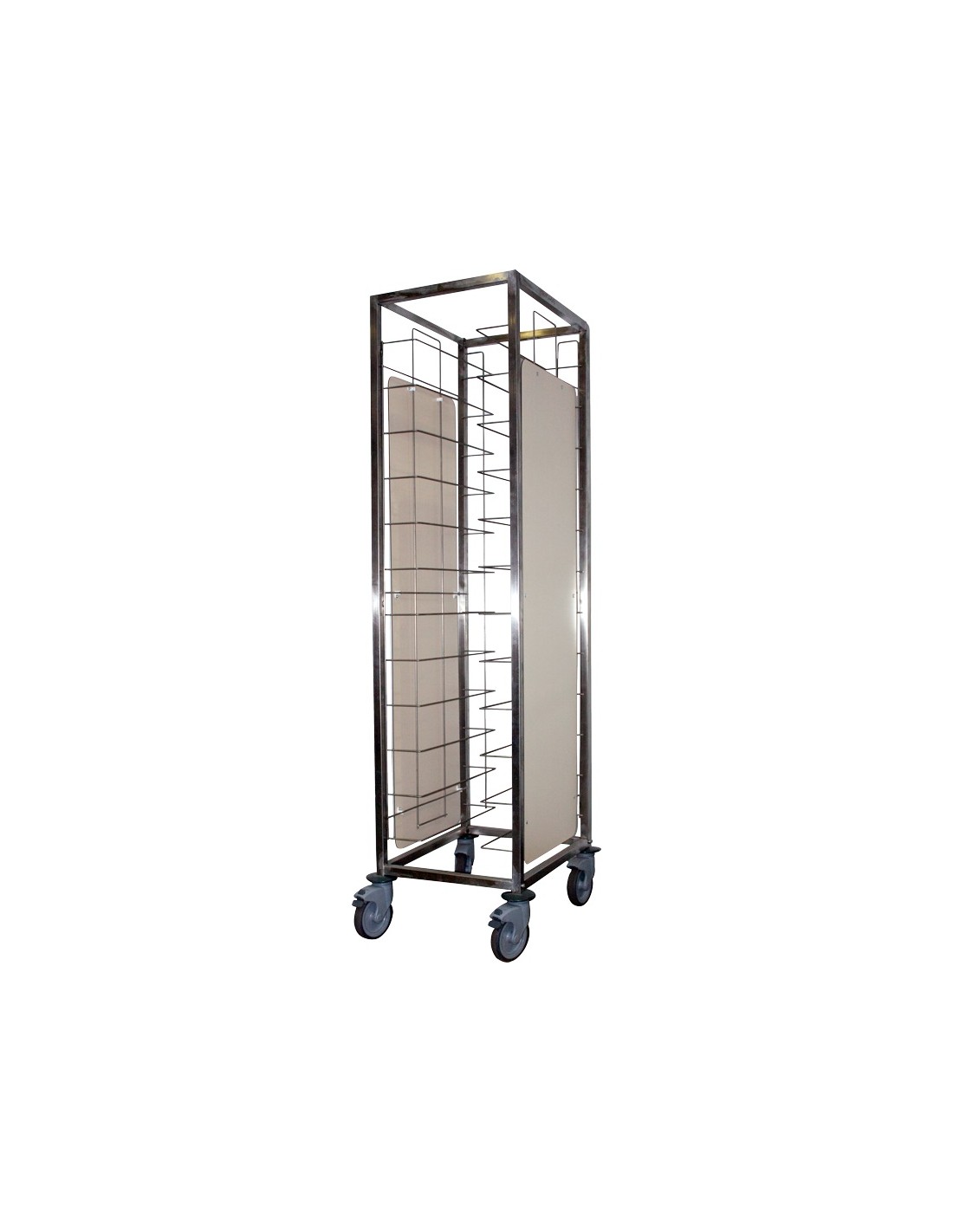 Construction inox Structure en tube inox 25x25 mm Glissières en fil inox espacées de 125 mm 4 roulettes chape polyamide ø 125 mm dont 2 freinées Convient aux plateaux largeur 280-360 mm, long max. 510 mm Avec joues en résine épaisseur 3 mm