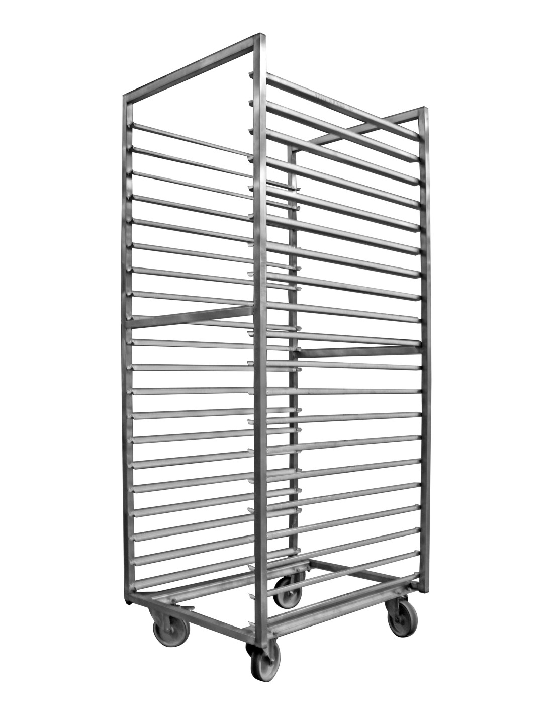 Construction inox monobloc en tube carré soudé 25x25 mm Plat anti-écartement à mi-hauteur Glissières anti-chute pointées avec butée 2 côtés 4 roulettes pivotantes ø 100 mm, sur platines électro-zinguée avec parechocs Roues non freinées, chape inox Glissières anti-chute avec butée 2 cotés