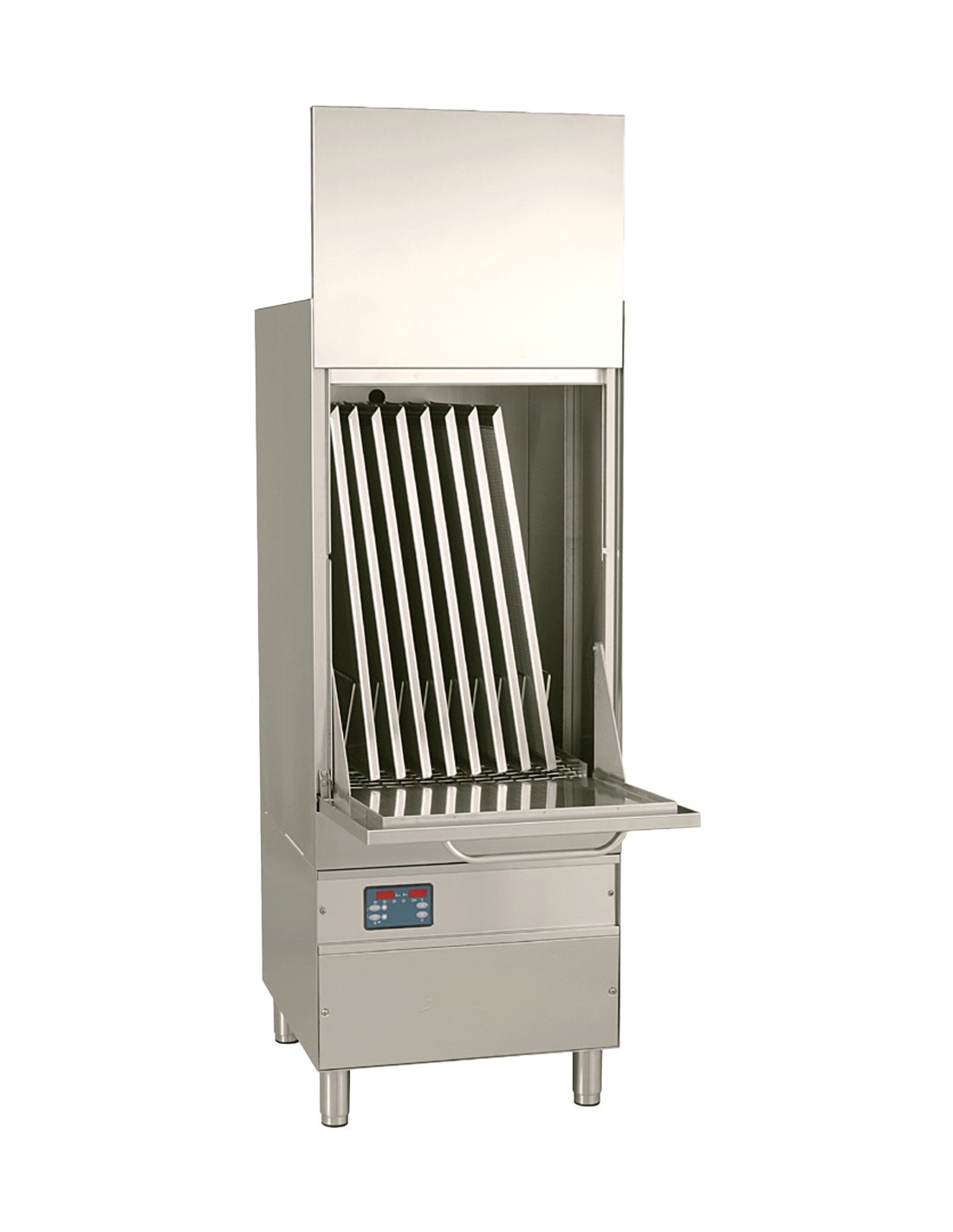 Carrosserie et bras de lavage inox AISI 304, porte doublée Panneau de commande électronique avec 4 programmes 4 cycles de lavages: 120/240/360/480 secondes Consommation d'eau : 4.7L/cycle - Equipé d'un surpresseur PAP Capacité cuve : 35L - Hauteur de chargement: 805 mm - Capacité boiler : 10L Dotation : 4 paniers (couverts, panier inox, support plateaux et grille inox) Pompe de vidange : non Pompe électrique de rinçage : non Pompe à détergent : oui Livré avec câble électrique d'alimentation, sans prise