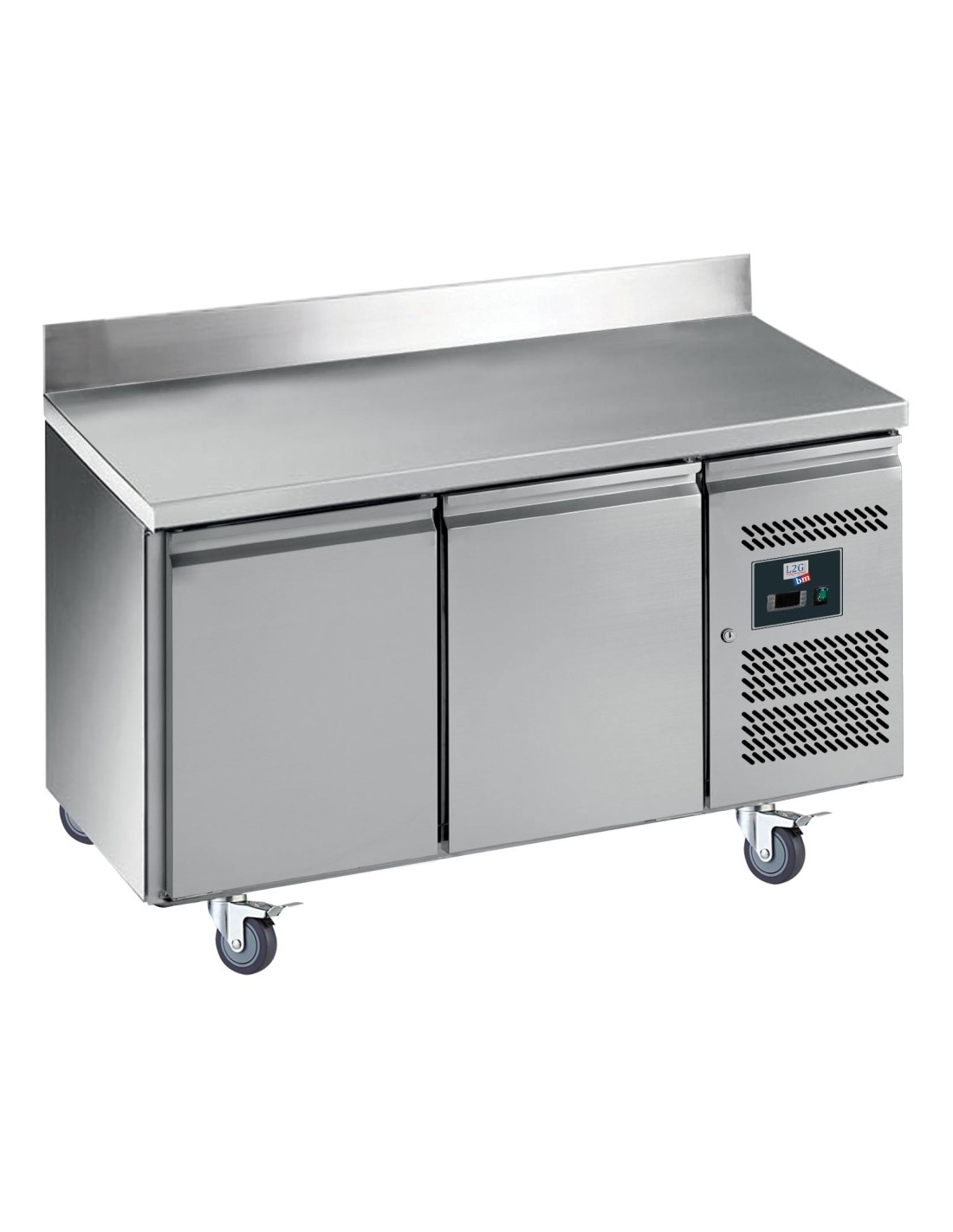 Construction inox intérieur et extérieur Réfrigération ventilée -2°C/+8°C, groupe logé extractible sur glissières, 1 niveau de glissières (pas de 45 mm, 9 niveaux max.) et 1 grille par porte Portes avec système de fermeture automatique Dégivrage automatique Evaporateur traité anticorrosion Isolation : 50 mm (mousse de polyuréthane) Thermostat électronique DIXELL Gaz réfrigérant : R600a Dosseret fermé 100x20 mm