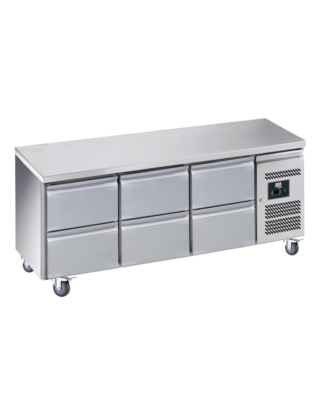 DESSERTE REFRIGEREE INOX CENTRALE -2/+8°C 3X2 TIROIRS, SUR ROULETTES Ø 100MM Tension : 230V Mono - Puissance (en kW) : 0.28 L (en mm) : 1 795 - P (en mm) : 700 H (en mm) : 850 - Cont. (en L) : 221 Type de gaz : R600 - Quantité de gaz (g) : 95