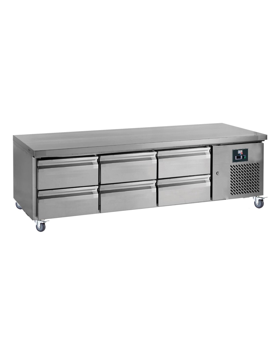 SOUBASSEMENT REFRIGERE -2/+8°C, 3X2 TIROIRS POUR BAC GASTRO GN1/1 Tension : 230V Mono - Puissance (en kW) : 0.66 L (en mm) : 1 795 - P (en mm) : 700 H (en mm) : 650 - Cont. (en L) : 255 SUR ROULETTES Ø 100 MM