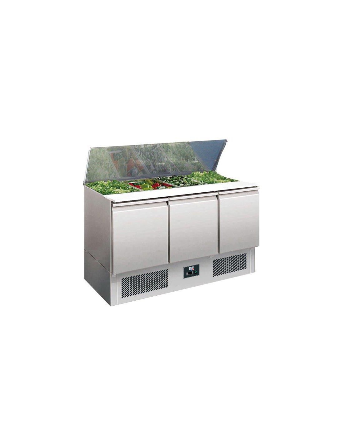 SALADETTE REFRIGEREE INOX COUVERCLE TELESCOPIQUE +2/+8°C, GAZ R290, 3 P. GN1/1, CAPACITE 4GN1/1 Tension : 230V Mono - Puissance (en kW) : 0.43 L (en mm) : 1 365 - P (en mm) : 700 H (en mm) : 850 - Cont. (en L) : 368 Type de gaz : R290 - Quantité de gaz (g) : 120