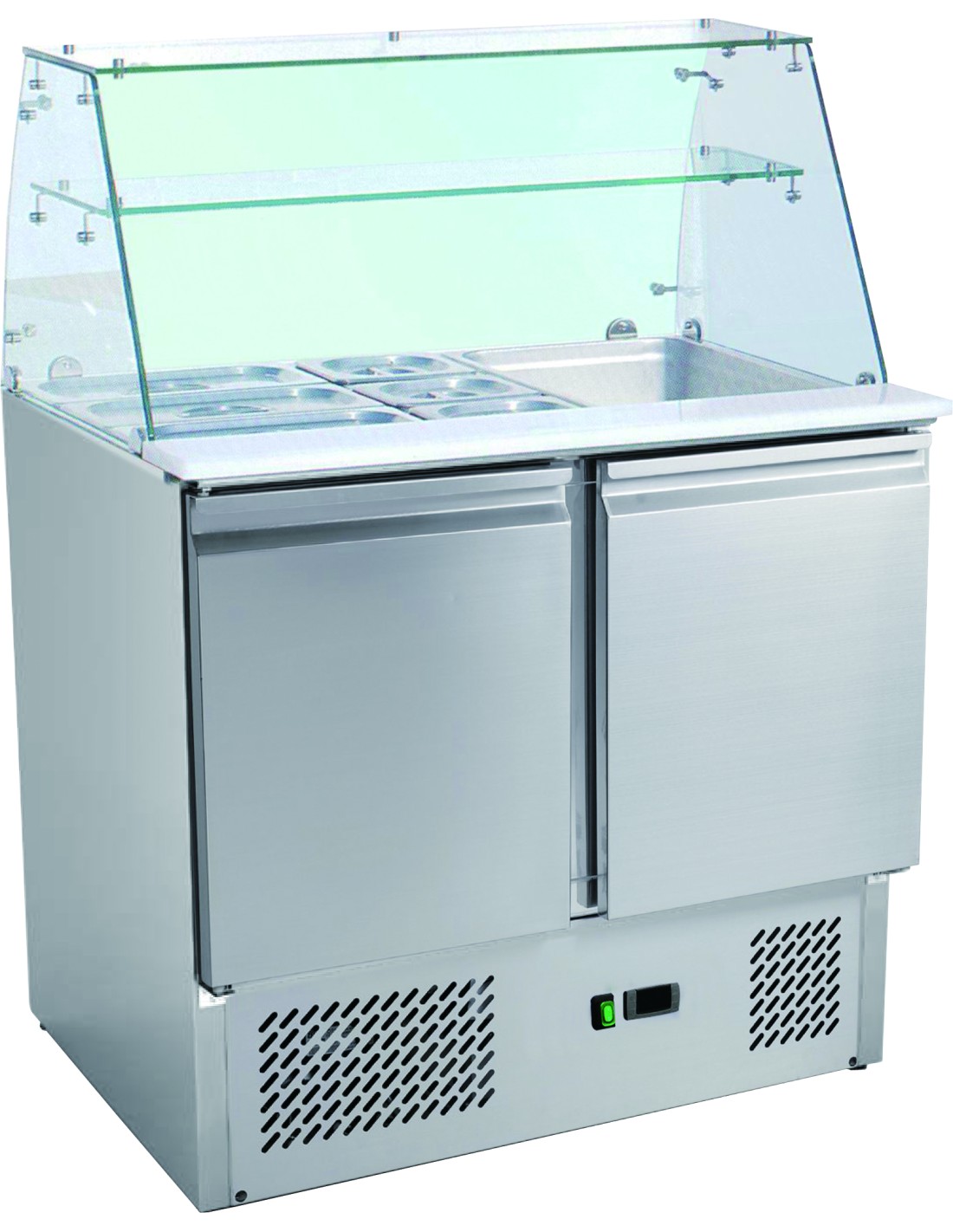 SALADETTE REFRIGEREE, PARE-HALEINE VERRE DROIT +2/+8°C, GAZ R600A, 2 P. GN1/1, CAP.2GN1/1+3GN1/6 Hauteur sans pare-haleine: 850 mm Tension : 230V Mono - Puissance (en kW) : 0.25 L (en mm) : 900 - P (en mm) : 700 H (en mm) : 1 310 - Fréquence (Hz) : 50 Type de gaz : R600A - Quantité de gaz (g) : 100