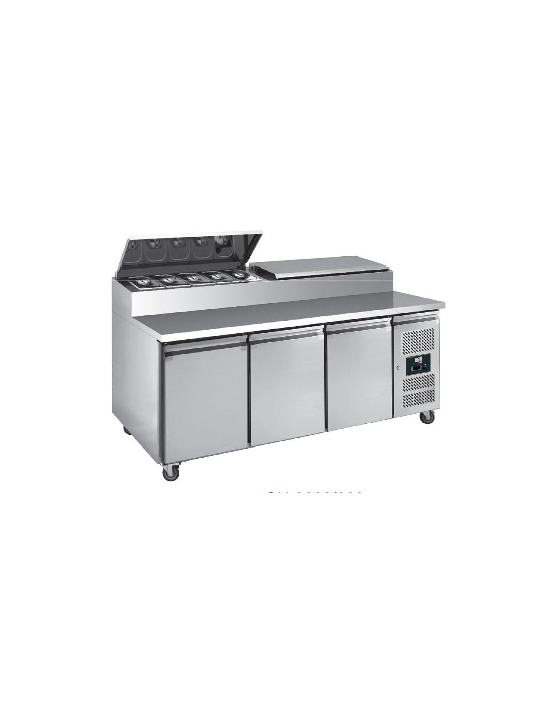 Construction inox intérieur et extérieur Réfrigération ventilée +2°C/+8°C, groupe logé Plan de travail en inox et 2 couvercles inox (capacité 6 à 10 GN1/3 non fournis) 3 portes avec système de fermeture automatique Dotation : 1 niveau de glissières et 1 grille par porte Dégivrage automatique, Isolation 50 mm (mousse polyuréthane) 4 roulettes dont 2 à freins ø 100 mm Thermostat électronique DIXELL Gaz réfrigérant : R290 Capacité 8 GN1/3