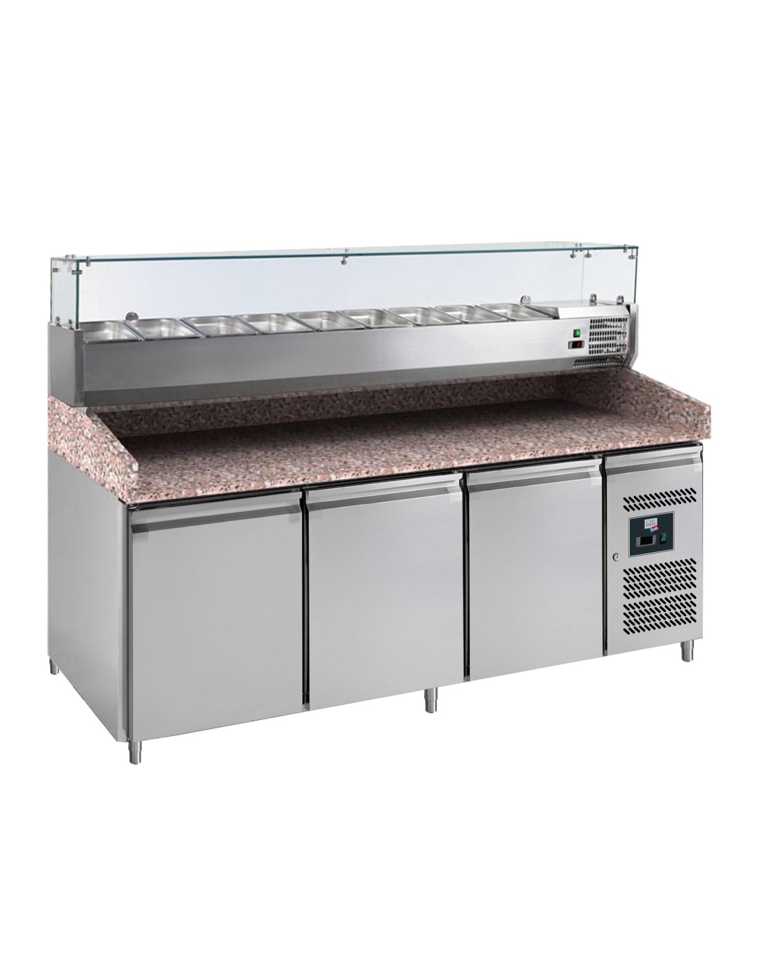 MEUBLE PIZZAS, 3 P. 600X400 MM, +2/+8°C, DESSUS GRANIT, AVEC VITRINE REFRIGEREE 9GN1/3-150 (BACS NON COMPRIS) PRODUIT COMBINE DONC SOUMIS A 2 ECOTAXES Tension : 230V Mono - Puissance (en kW) : 0.52 L (en mm) : 2 020 - P (en mm) : 800 H (en mm) : 1 435 - Cont. (en L) : 580 Type de gaz : R290 - Quantité de gaz (g) : 120