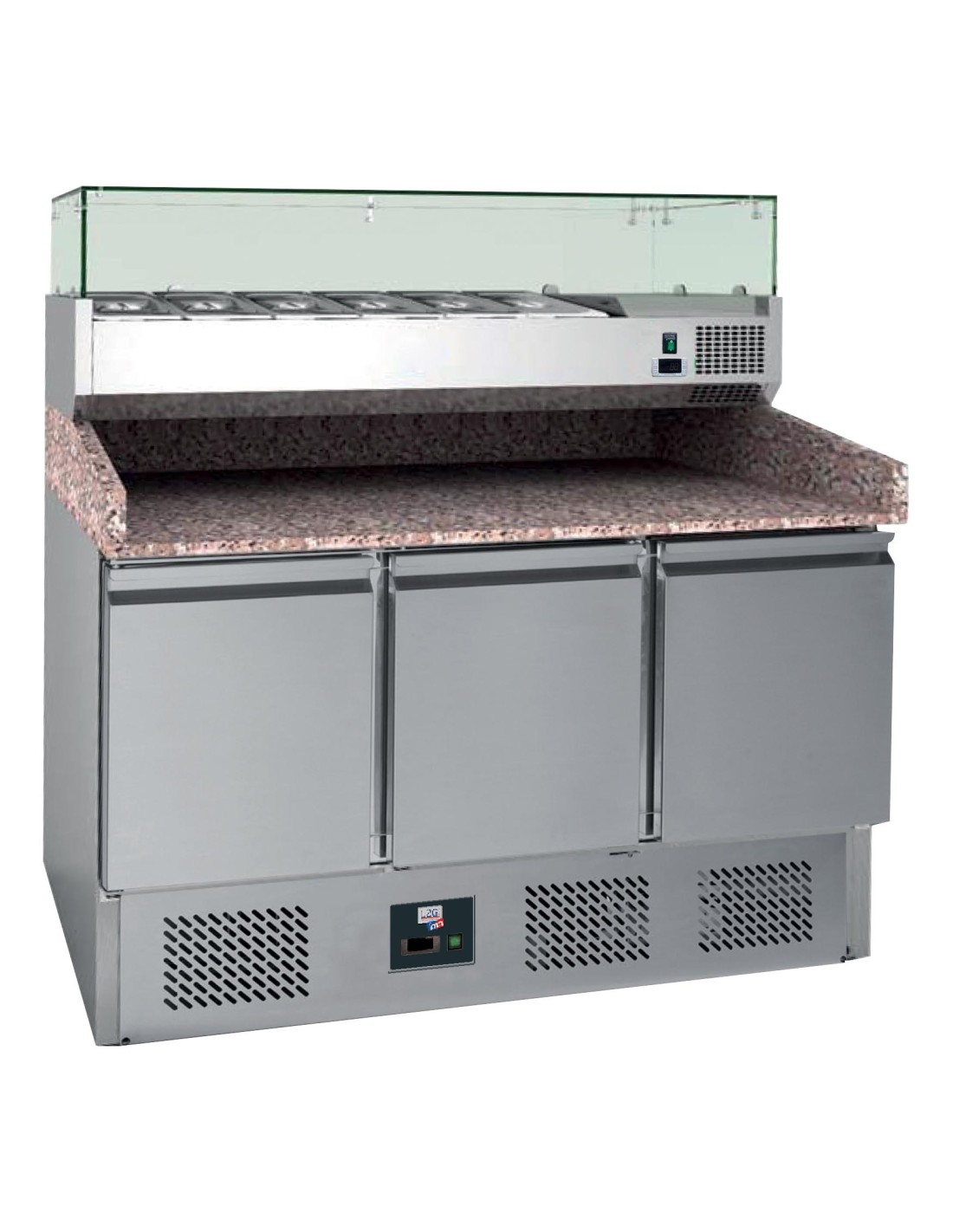 MEUBLE PIZZAS REFRIGERE GROUPE EN DESSOUS +2/+8°C GAZ R290, DESSUS GRANIT, 3 P. GN1/1, AVEC VITRINE A INGREDIENTS 6GN1/3-150 (BACS NON COMPRIS) PRODUIT COMBINE DONC SOUMIS A 2 ECOTAXES Tension : 230V Mono - Puissance (en kW) : 0.6 L (en mm) : 1 400 - P (en mm) : 700 H (en mm) : 1 020 - Cont. (en L) : 368 Type de gaz : R290 - Quantité de gaz (g) : 120