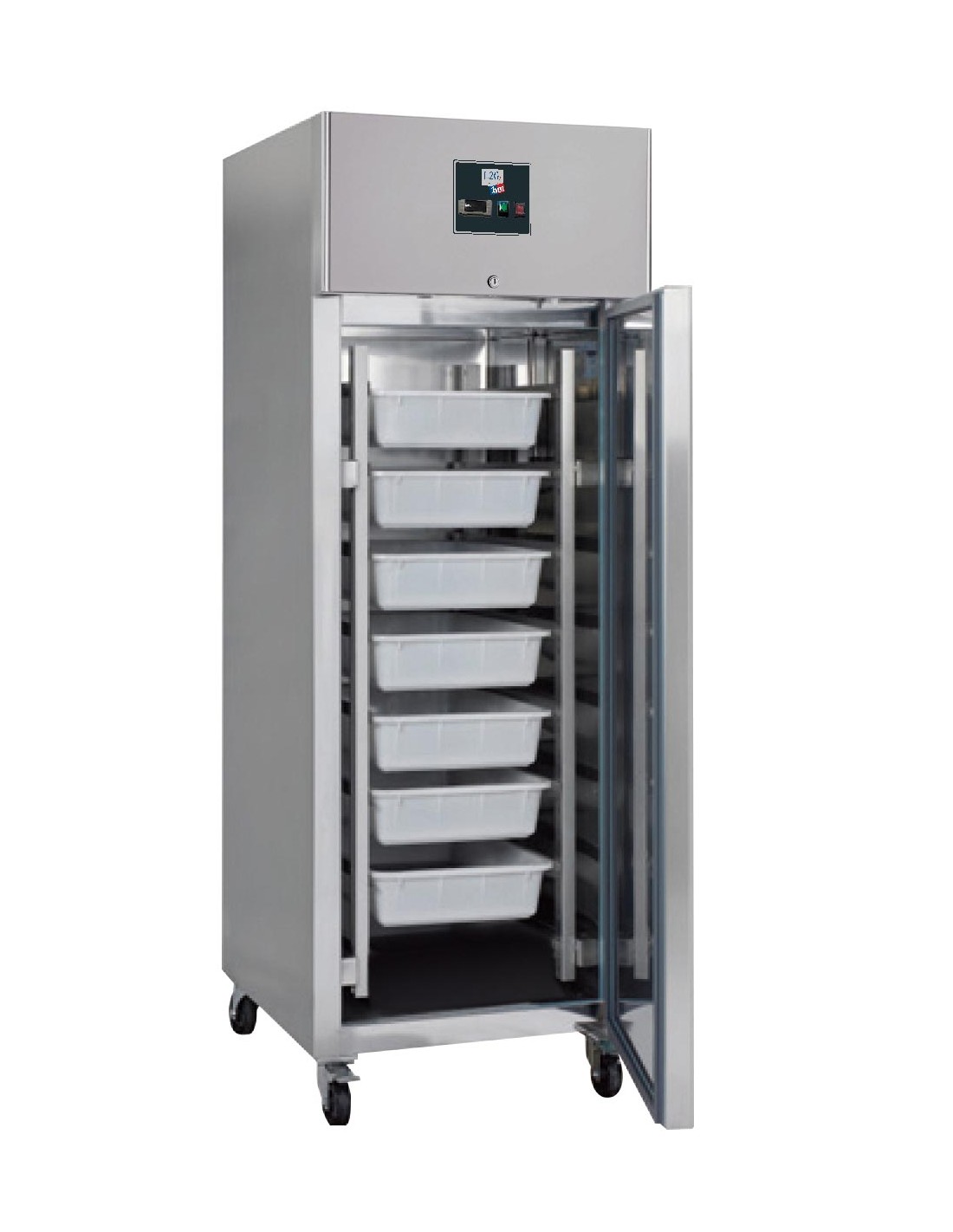 ARMOIRE REFRIGEREE INOX, -5/+5°C, FROID STATIQUE, 7 BACS 600X400X90MM + 7 GRILLES Tension : 230V Mono - Puissance (en kW) : 0.3 L (en mm) : 680 - P (en mm) : 810 H (en mm) : 2 010 - Cont. (en L) : 600