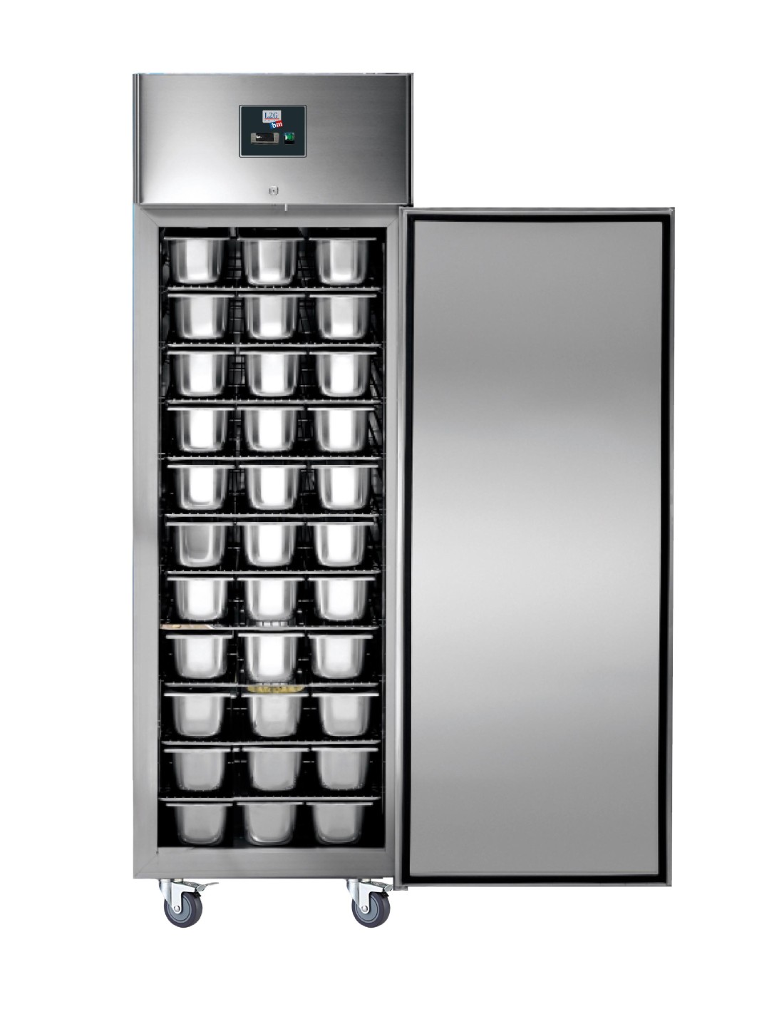 Construction inox intérieur et extérieur, 4 roulettes Réfrigération ventilée -18/-22°C, groupe logé Dégivrage automatique Porte à fermeture automatique avec joint magnétique Isolation : 60 mm (mousse de joint polyuréthane) Thermostat électronique DIXELL Réfrigérant : R290 Niveau de bruit 67.9 dB 10 niveaux de grilles 600x800, capacité maximum 60 bacs de 4 L Fermeture à clé