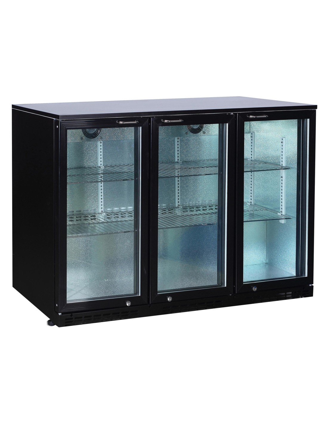 MEUBLE ARRIERE DE BAR SKIN PLATE 0/+8°C, 3 PORTES BATTANTES VITREES, 6 CLAYETTES CHROMEES ECLAIRAGE INTERIEUR LED PORTES EN PLASTIQUE NOIR THERMOSTAT DIXELL Tension : 230V Mono - Puissance (en kW) : 0.35 L (en mm) : 1 350 - P (en mm) : 520 H (en mm) : 900 - Fréquence (Hz) : 50 Type de gaz : R600A - Quantité de gaz (g) : 85