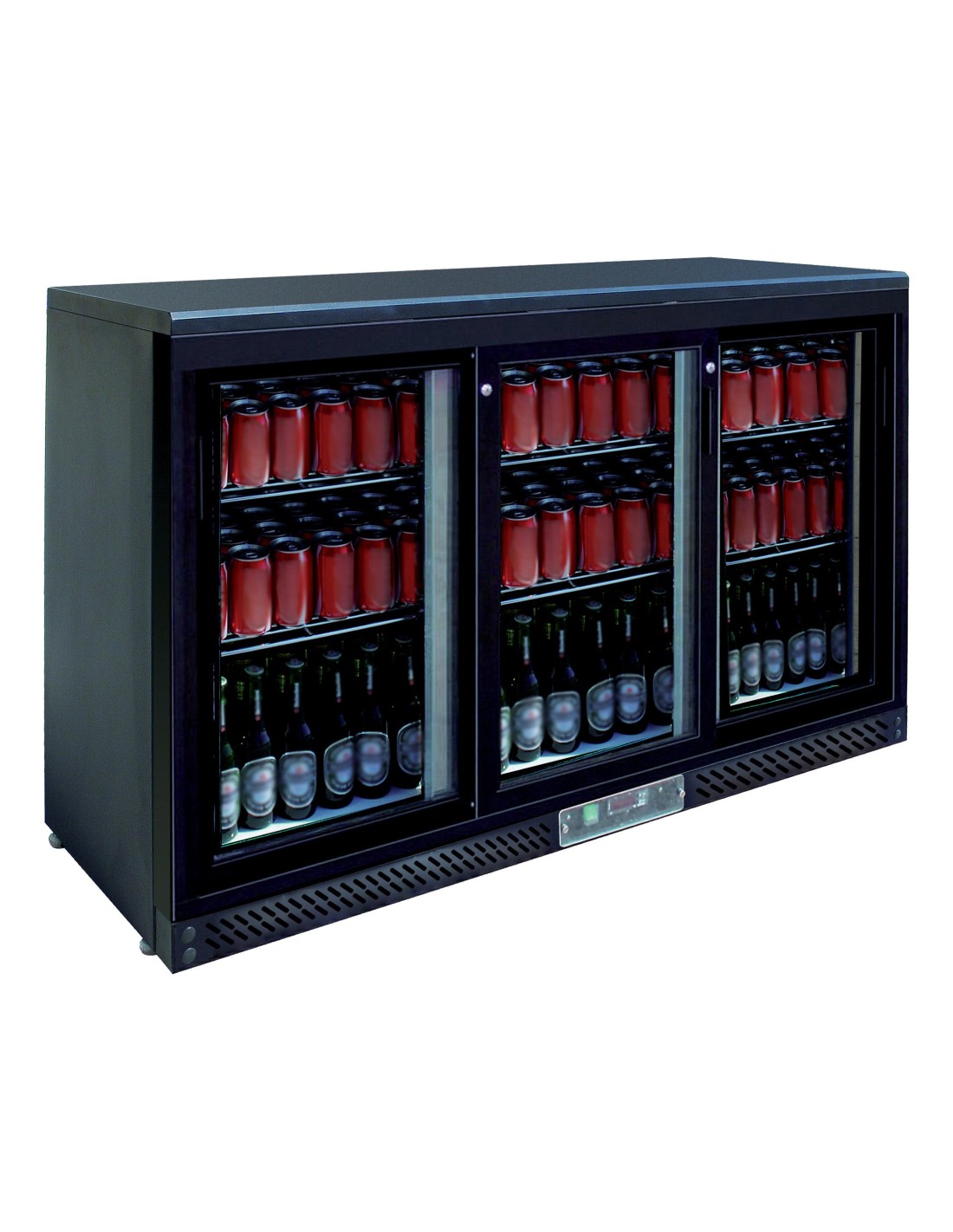 MEUBLE ARRIERE DE BAR, SKIN PLATE 0/+8°C, 3 PORTES COULISSANTES VITREES, 6 CLAYETTES Tension : 230V Mono - Puissance (en kW) : 0.35 L (en mm) : 1 350 - P (en mm) : 520 H (en mm) : 900 - Cont. (en L) : 382 Fréquence (Hz) : 50 - Type de gaz : R600A Quantité de gaz (g) : 90