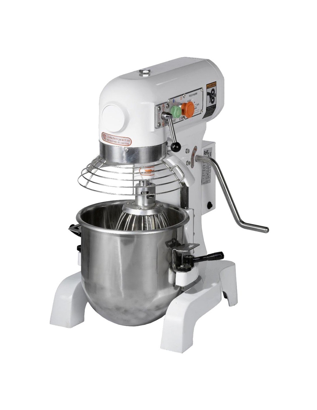Bol, grille de protection et outils en inox Construction robuste avec châssis mécano-soudé, peint époxy Livré avec 3 outils inox et 1 cuve inox : crochet, palette et fouet 3 vitesses + arrêt d’urgence Bol amovible : ø 244 x H-285 mm, 3 kg