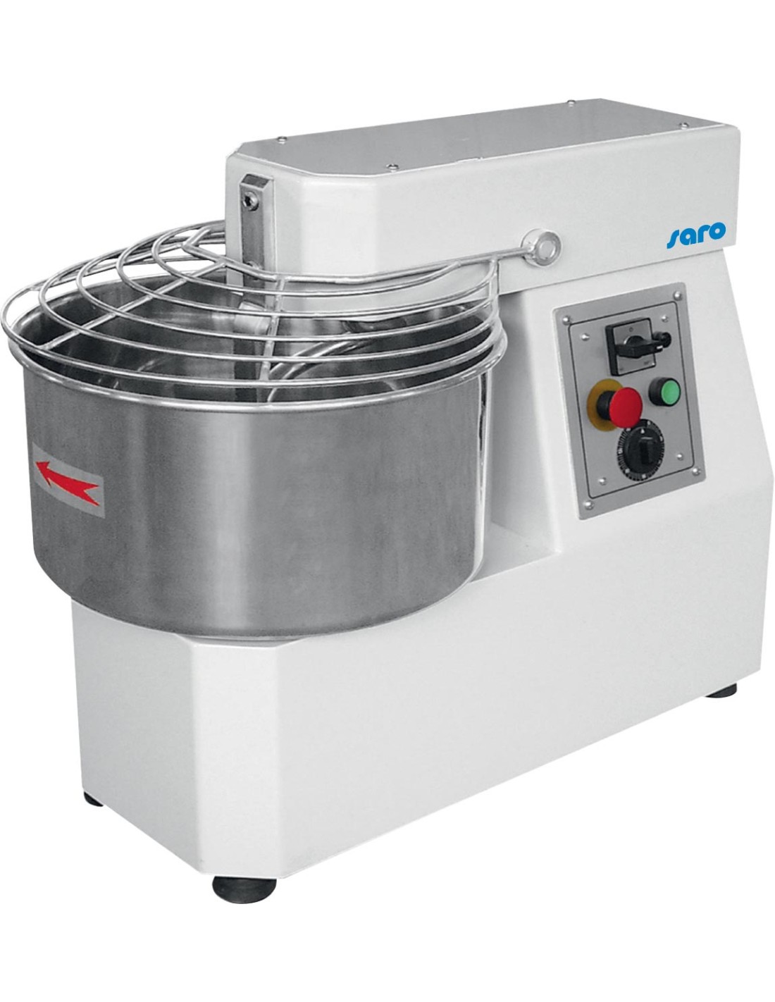 Carrosserie en acier épais Bol, spirale, arbre central et écran de protection en inox Toutes les pièces tournantes sont assemblées sur des roulements à billes scellés Commandes avec une vitesse fixe et arrêt d’urgence Tête fixe Cuve inox fixe Capacité : 38 kg