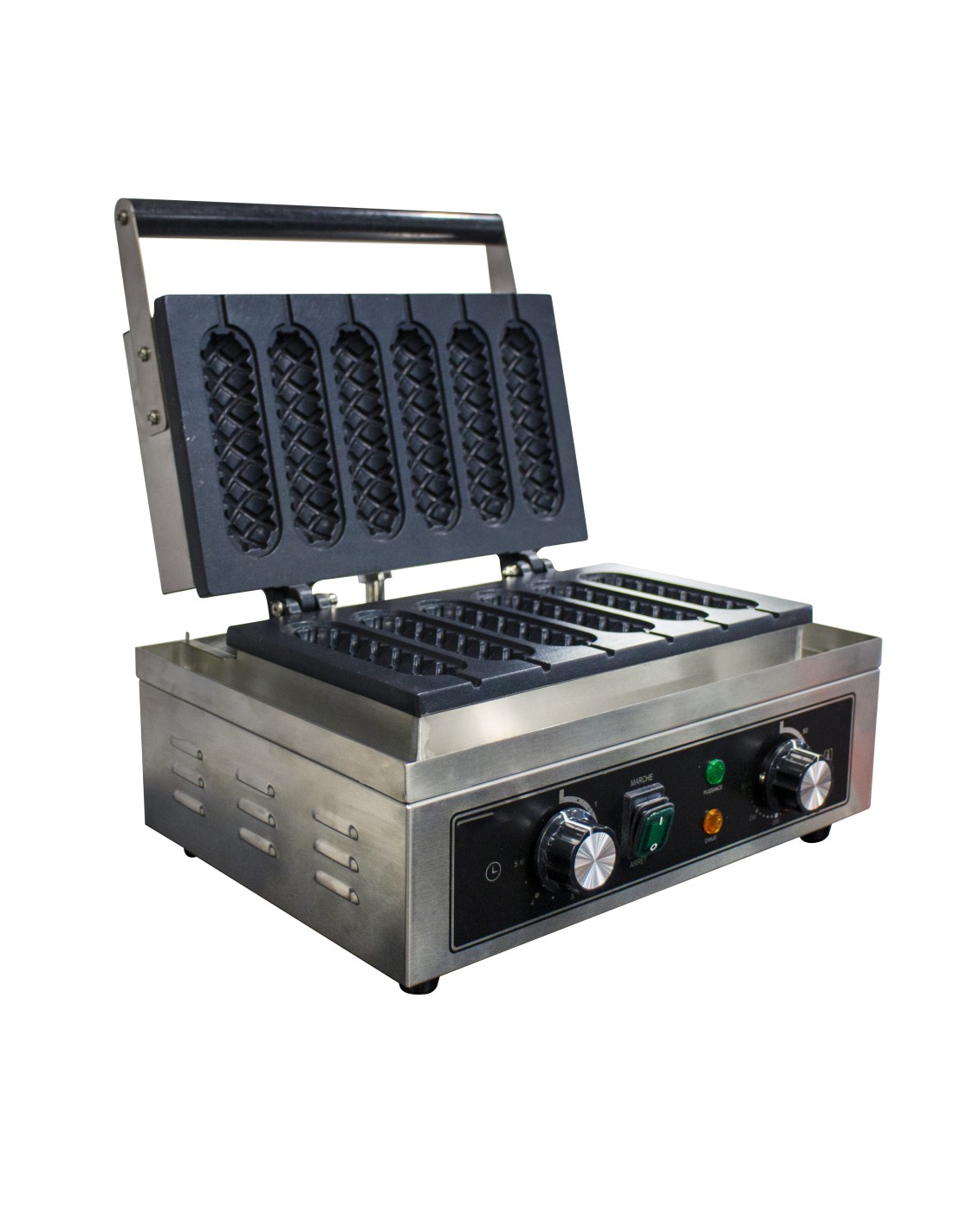Construction en INOX Plaques chauffantes en aluminium et téflon, revêtement anti-adhésif Pour préparer 6 gaufres-épi simulanément Avec minuterie Réglage manuel de température de +50°C à + 300 °C Prévoir bâtonnet de 200mm minimum pour la gaufre