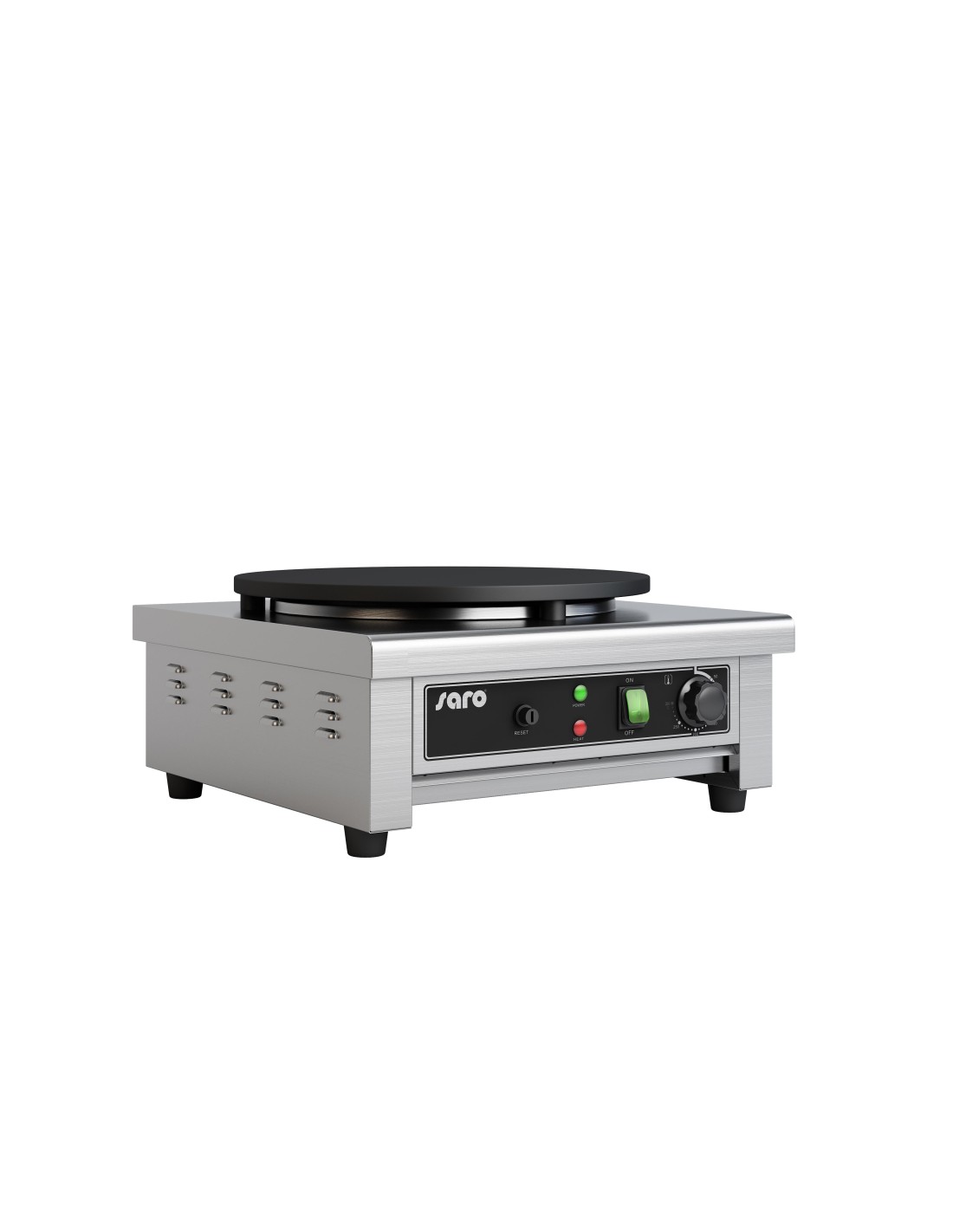 Construction inox Plaque en fonte ø 400 mm anti-adhésive Thermostat réglable de 0 à 300°C Répartition uniforme de la chaleur Voyant lumineux de sécurité Tiroir de récupération des déchets de cuisson Fournie avec une spatule en hêtre