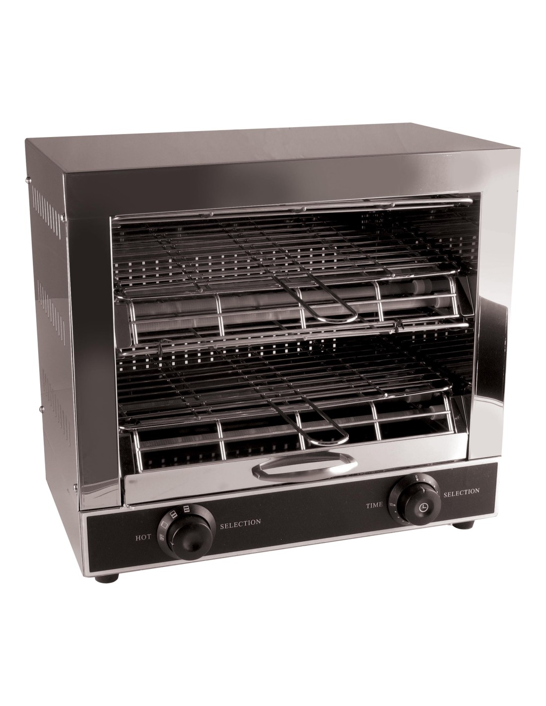 Construction tout inox Résistances chauffantes en quartz Minuterie 30 minutes Avec tiroir collecteur de miettes en acier inoxydable Dims intérieures: 355x240x(2x50)mm