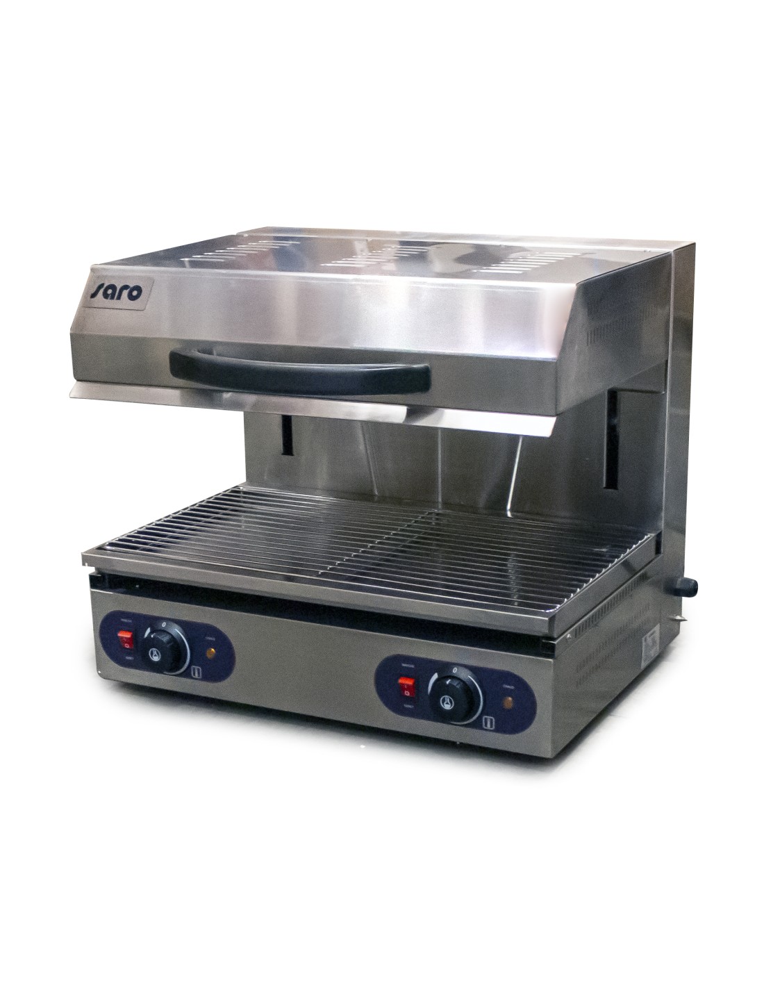 Construction tout inox Réglage de puissance et voyants lumineux Hauteur variable réglage par système de levage Bac collecteur amovible avec grille de 590x320 mm Résistances blindées Se fixe au mur : trous oblongs, pattes de fixation incluses