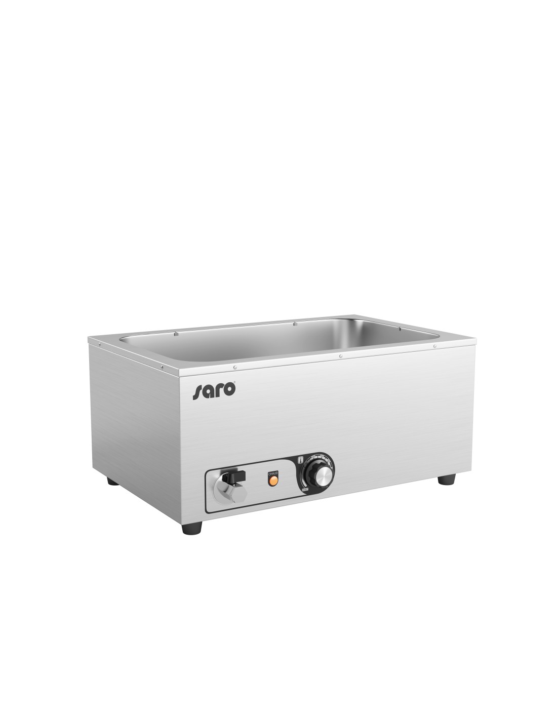 Acier inoxydable Voyant lumineux Température réglable en continu jusqu'à 85°C Pour bacs gastronormes de profondeur 150 mm max (non inclus) Avec robinet de vidange en façade