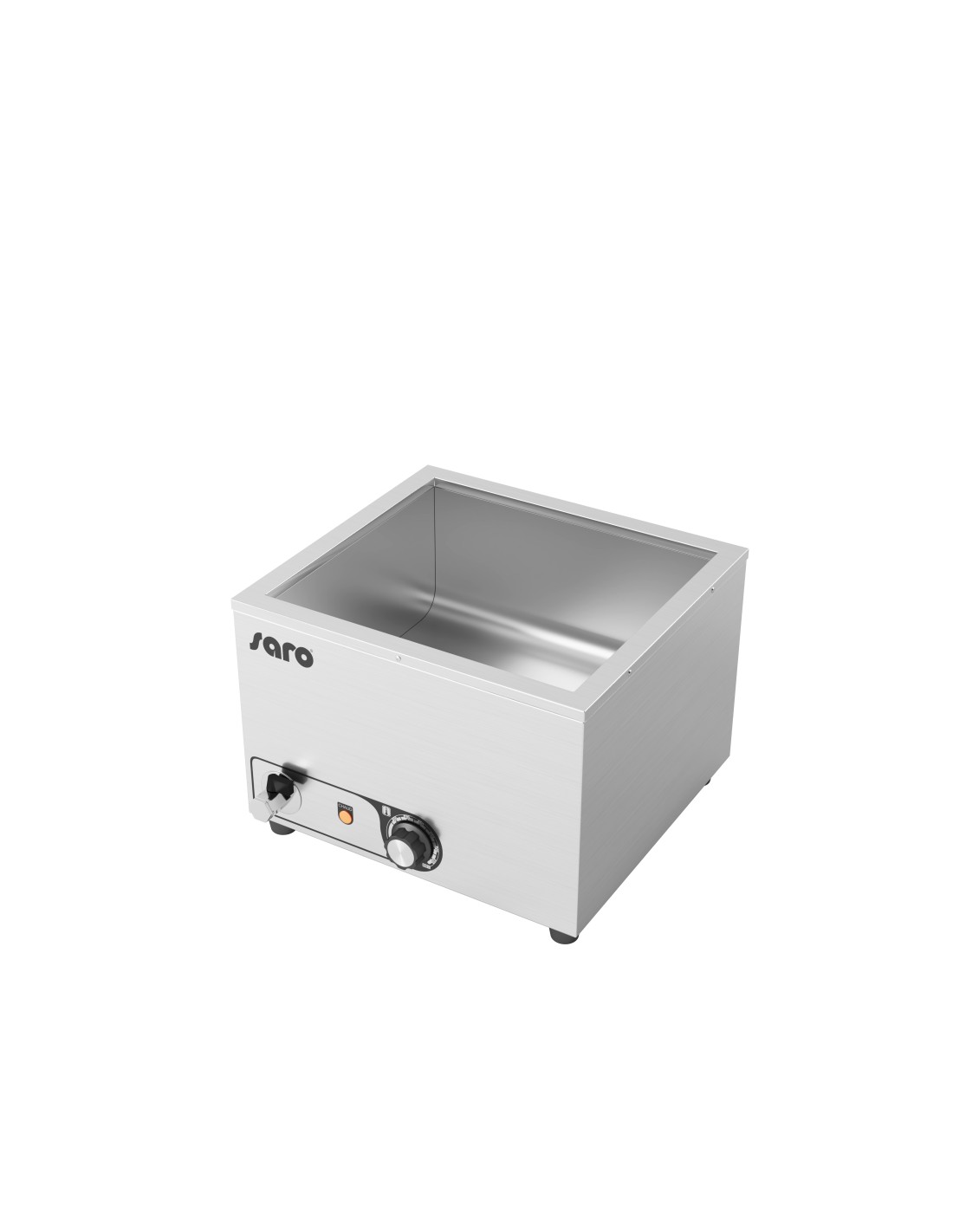 Acier inoxydable Voyant lumineux de température Température réglable en continu jusqu'à 85°C Pour bacs gastronormes de profondeur 150 mm max (non inclus) Avec robinet de vidange en façade