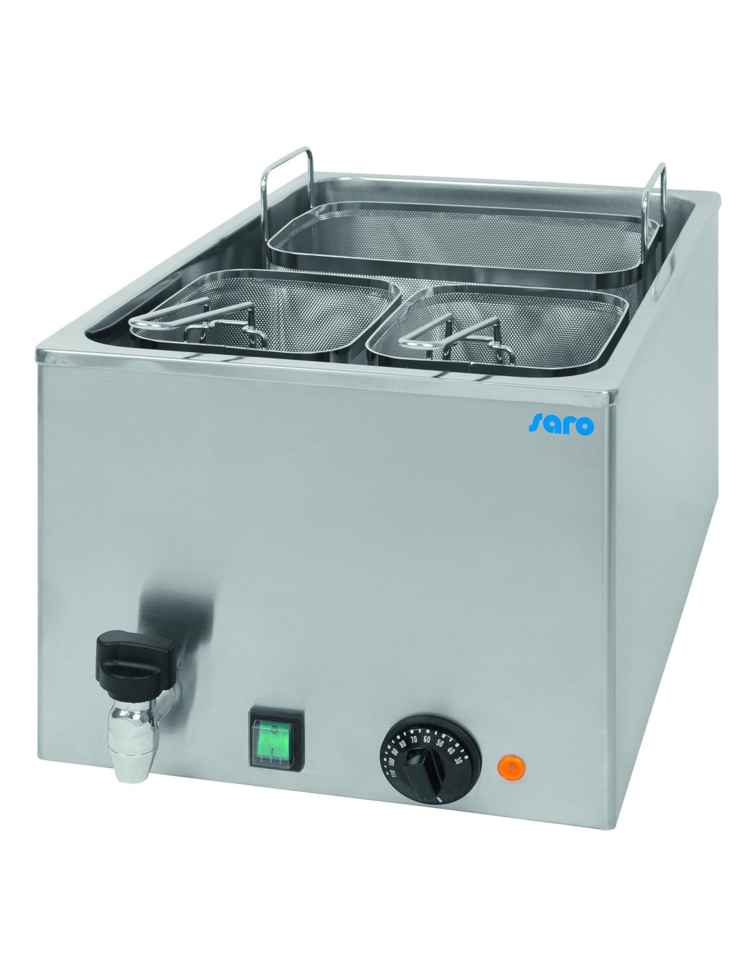 Construction tout inox Température réglable en continu jusqu’à 110°C 1 panier de dim. : 260x170x160 mm 2 paniers de dim .: 130x170x160 mm Cuve 25 L emboutie, avec robinet de vidange Résistance sécurisée contre la surchauffe à sec Thermostat de sécurité