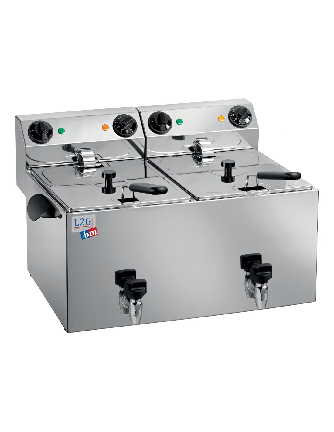 FRITEUSE ELECTRIQUE 2 CUVES DE 8L AVEC ROBINET DE VIDANGE Tension : 230V Mono - Puissance (en kW) : 2X3.25 L (en mm) : 595 - P (en mm) : 430 H (en mm) : 380