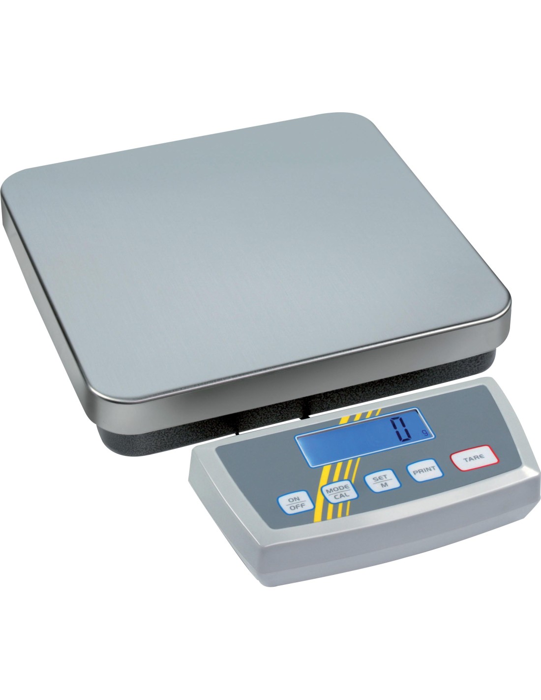 Afficheur LCD 25 mm Alimentation secteur ou pile 9 V Indicateur avec câble de 1,5 m Fonction brut/tare/net Livrée avec chargeur secteur Dimensions plateau : 315x305 mm