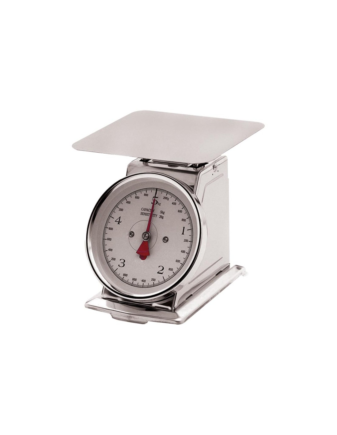 Corps et plate-forme pleine supérieure en inox 18/10 Bouton de régulation Portée 5 Kg Précision : 20 Gr Plateau inox amovible D.200 mm