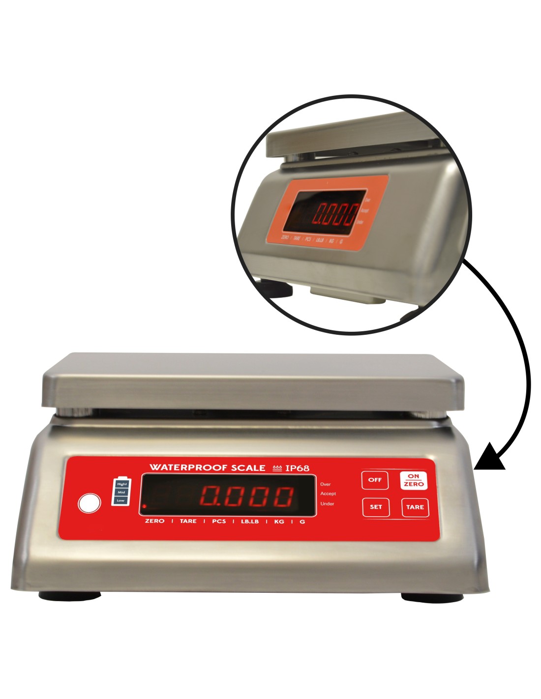 Balance de préparation certifié contact alimentaire Etanche IP68 avec une précision au 0,5 gr - Résolution 0.1gr Recommandé en cuisine, labo ou univers humide Pesage / Tarage / Auto-zéro Auto-off 10min / Rétro-éclairage Voyant surcapacité - Autonomie : 70h Batterie Battery 6V/4Ah rechargeable + alimentation externe Plateau inox 304 : 188×226x1mm 1 Ecran 83x29,5mm + 2eme Ecran Usage :professionnel, Métiers de bouche, agriculteurs, Agro-alimentaire