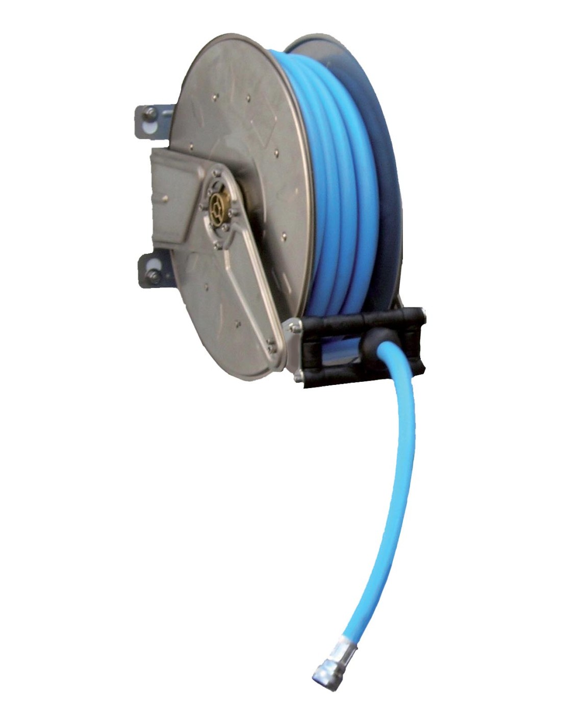 ENROULEUR AUTOMATIQUE INOX , TUYAU ALIMENTAIRE DE 10M BLEU AVEC EMBOUT ET COUPLEUR SANS PISTOLET L (en mm) : 484 - L (en mm) : 390 H (en mm) : 110