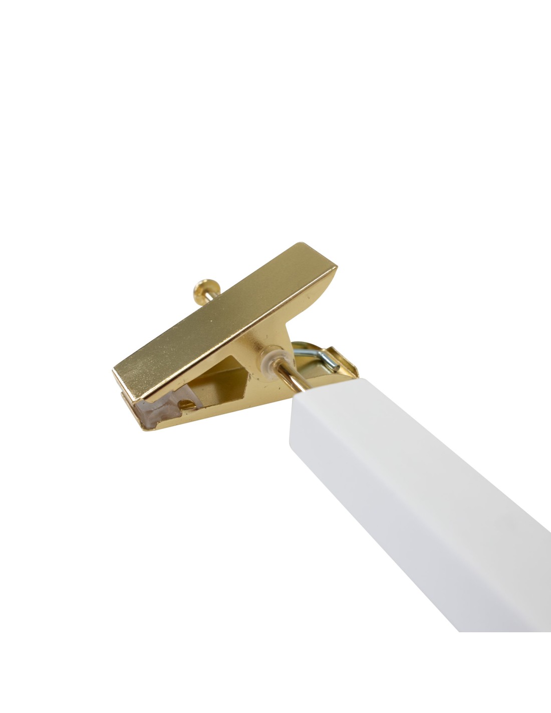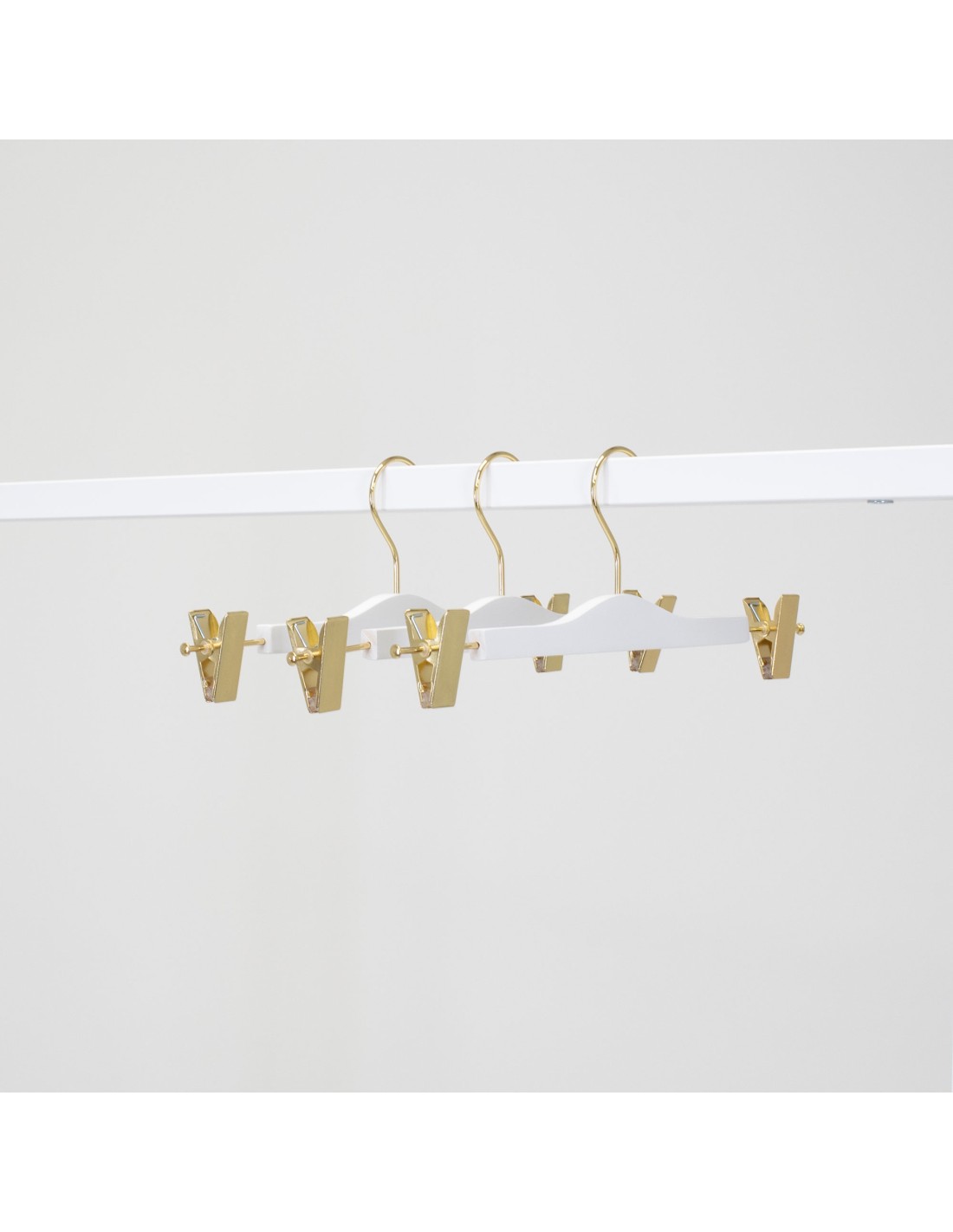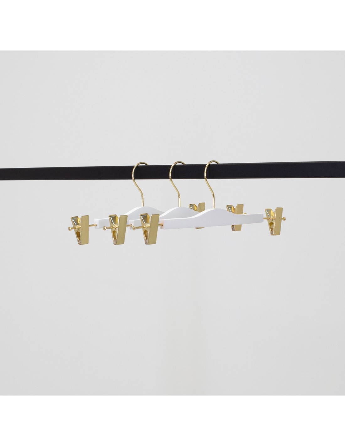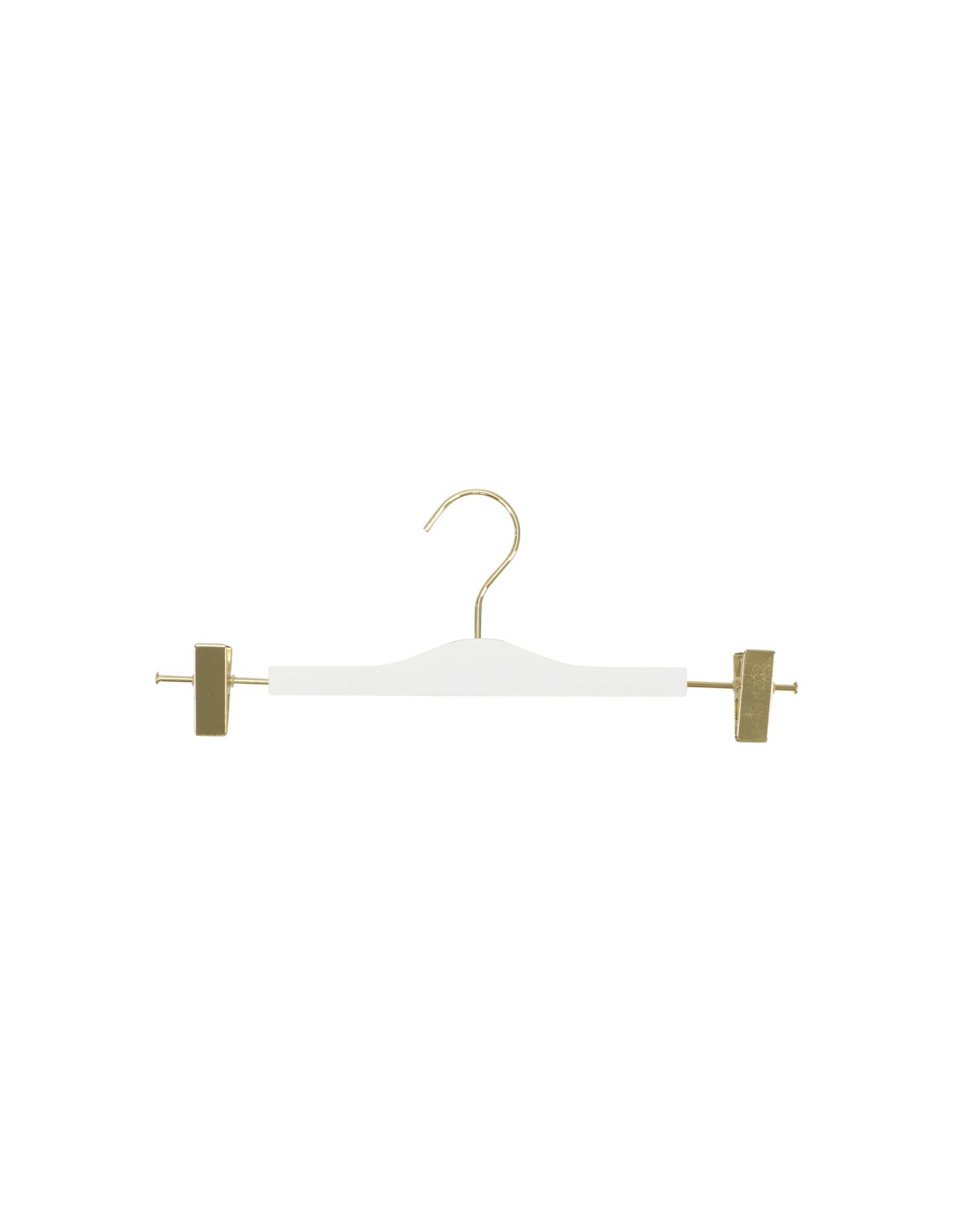 | Cintre en bois pour pantalons et jupes, avec pinces réglables, en bois de lotus, largeur 34 cm, finition blanc mat avec crochet et pinces dorées chromés - carton de 100 pcs |