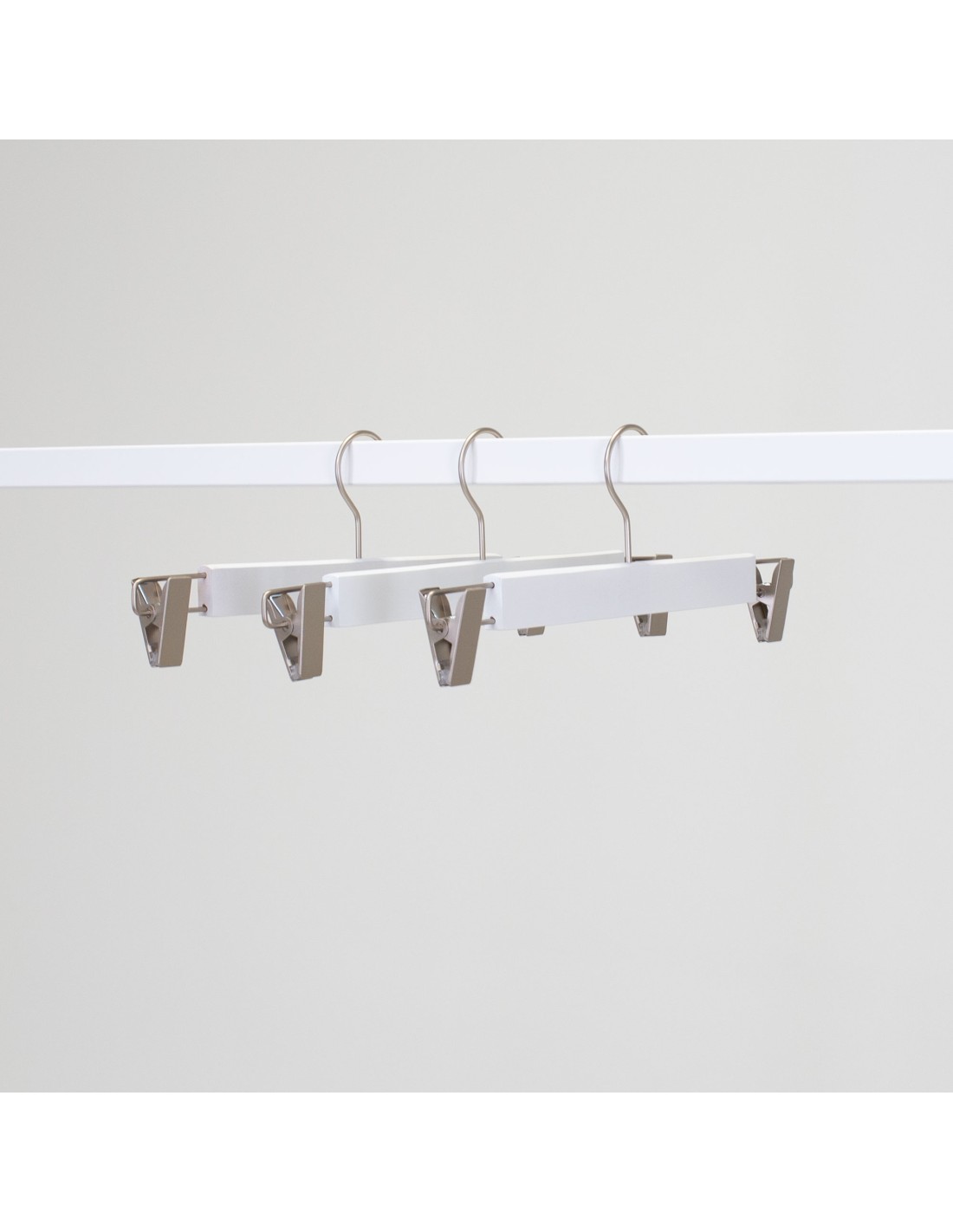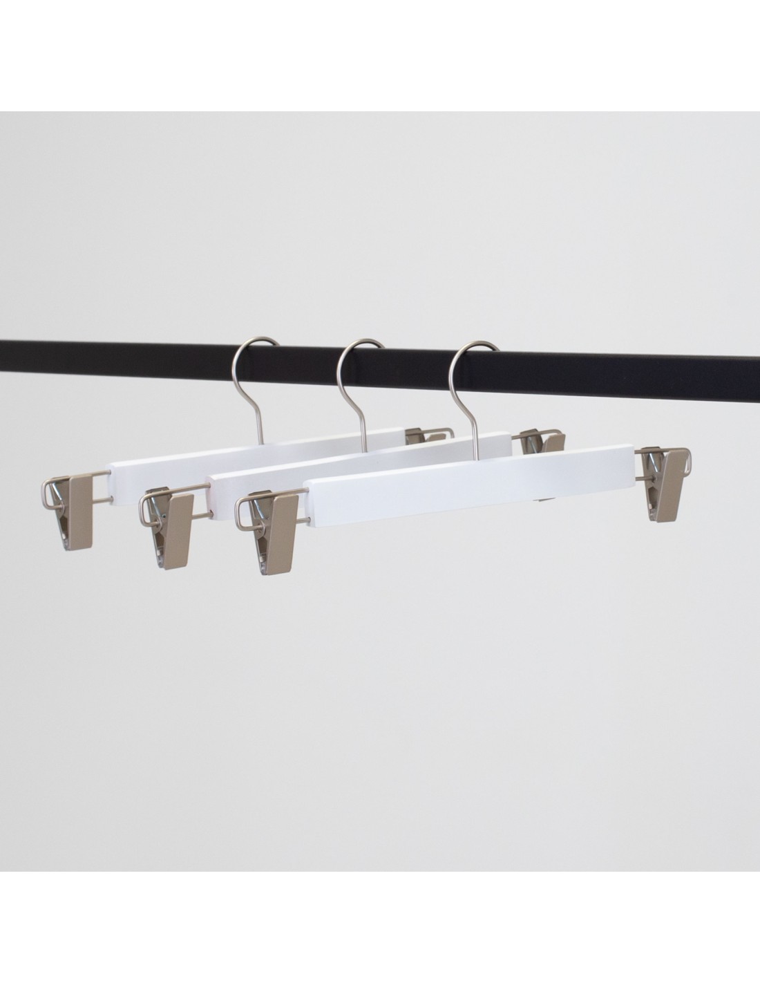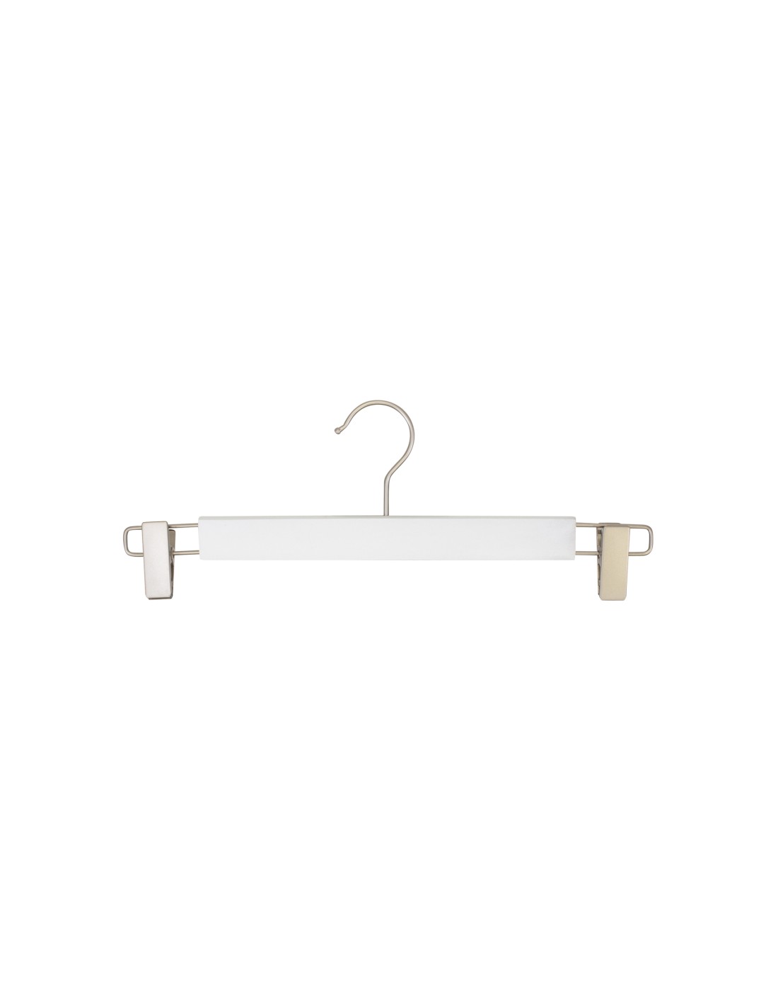 | Cintre en bois pour pantalons et jupes, avec pinces réglables en nickel, bois lotus, largeur 34 cm, finition blanc mat, crochet nickel mat - carton de 100 pcs. |