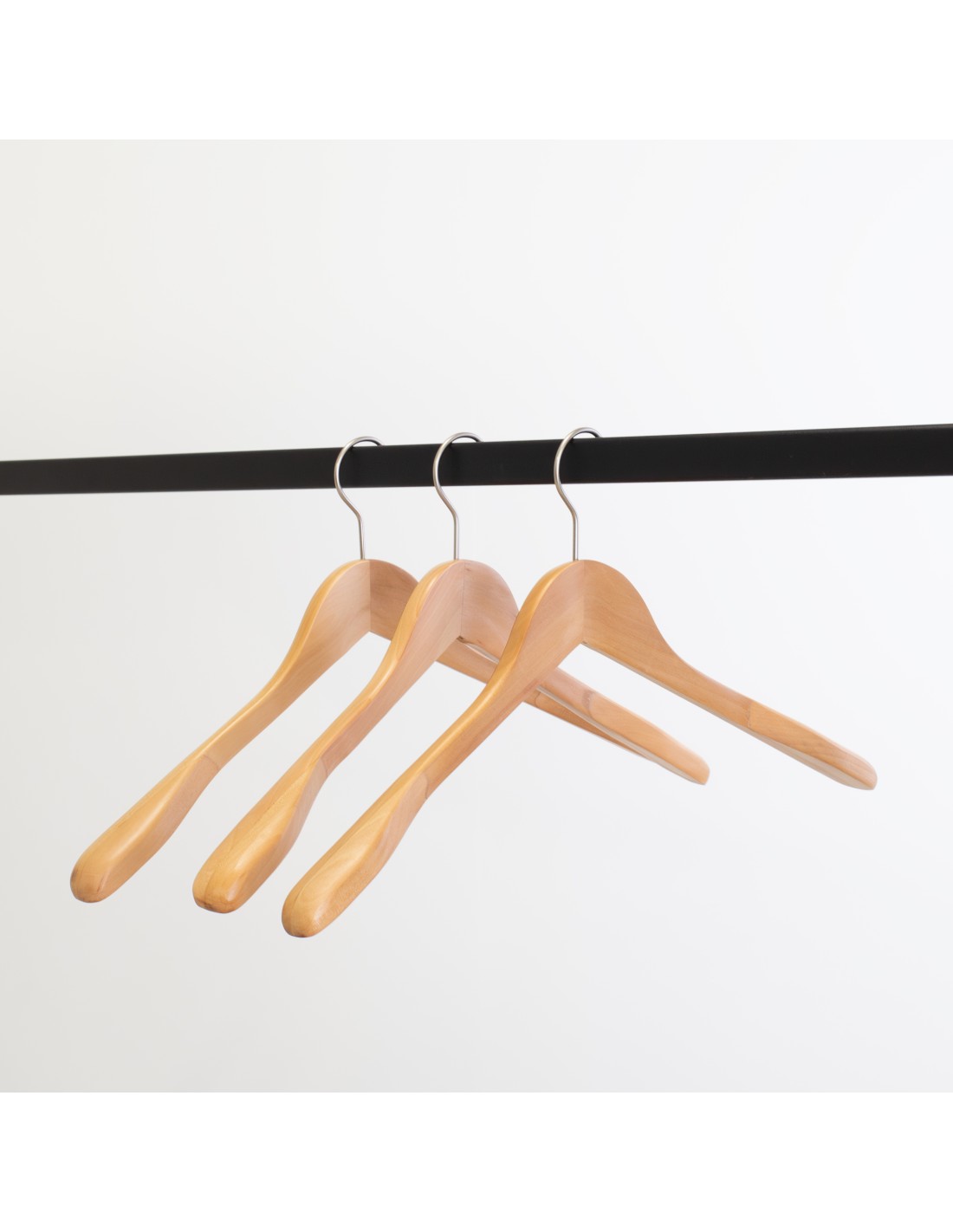 | Cintre en bois pour blazers, vestes et manteaux, légèrement galbé, largeur 44 cm, largeur aux épaules 3 cm, bois de lotus finition vernis transparent. Crochet en nickel mat - carton de 50 pcs |