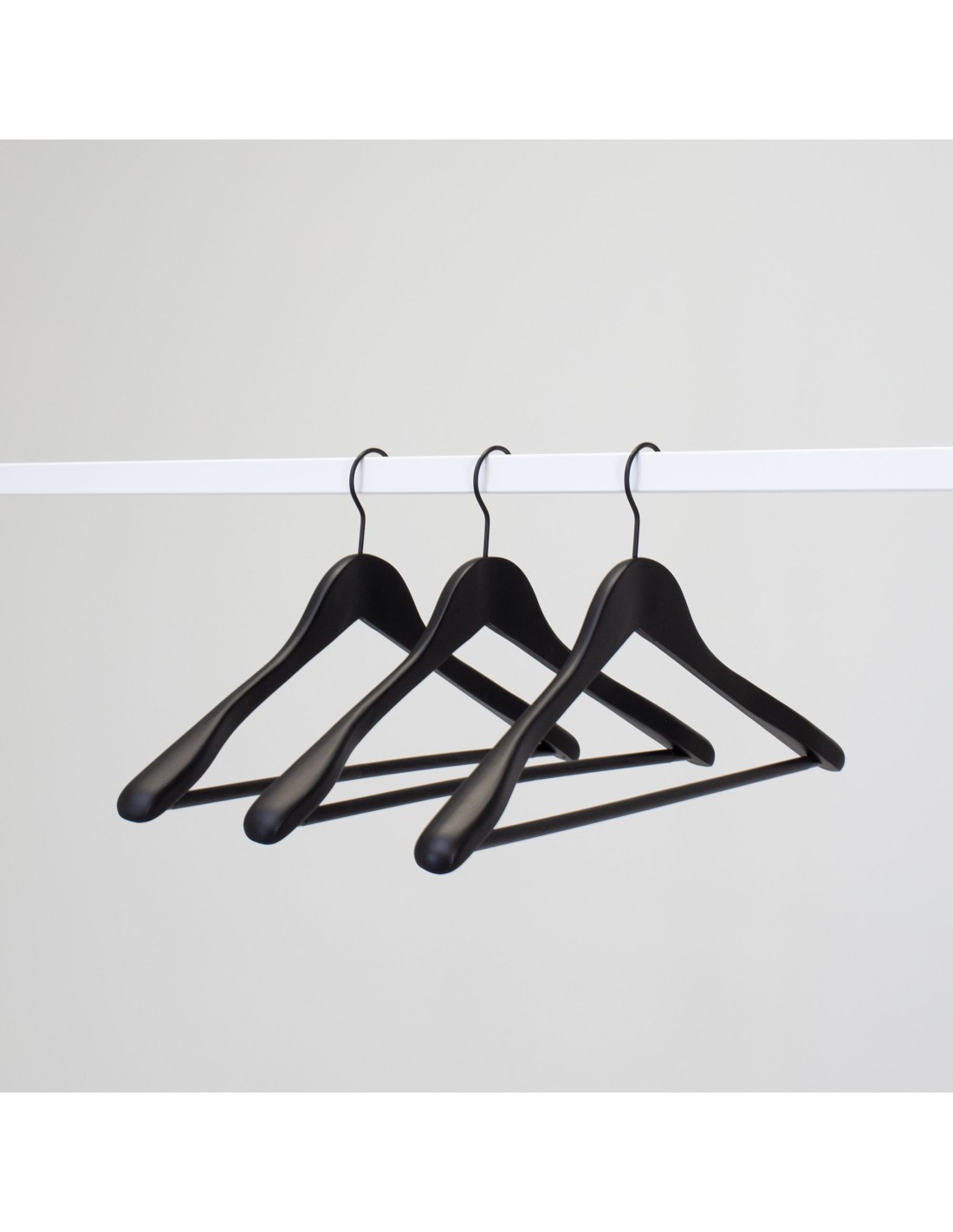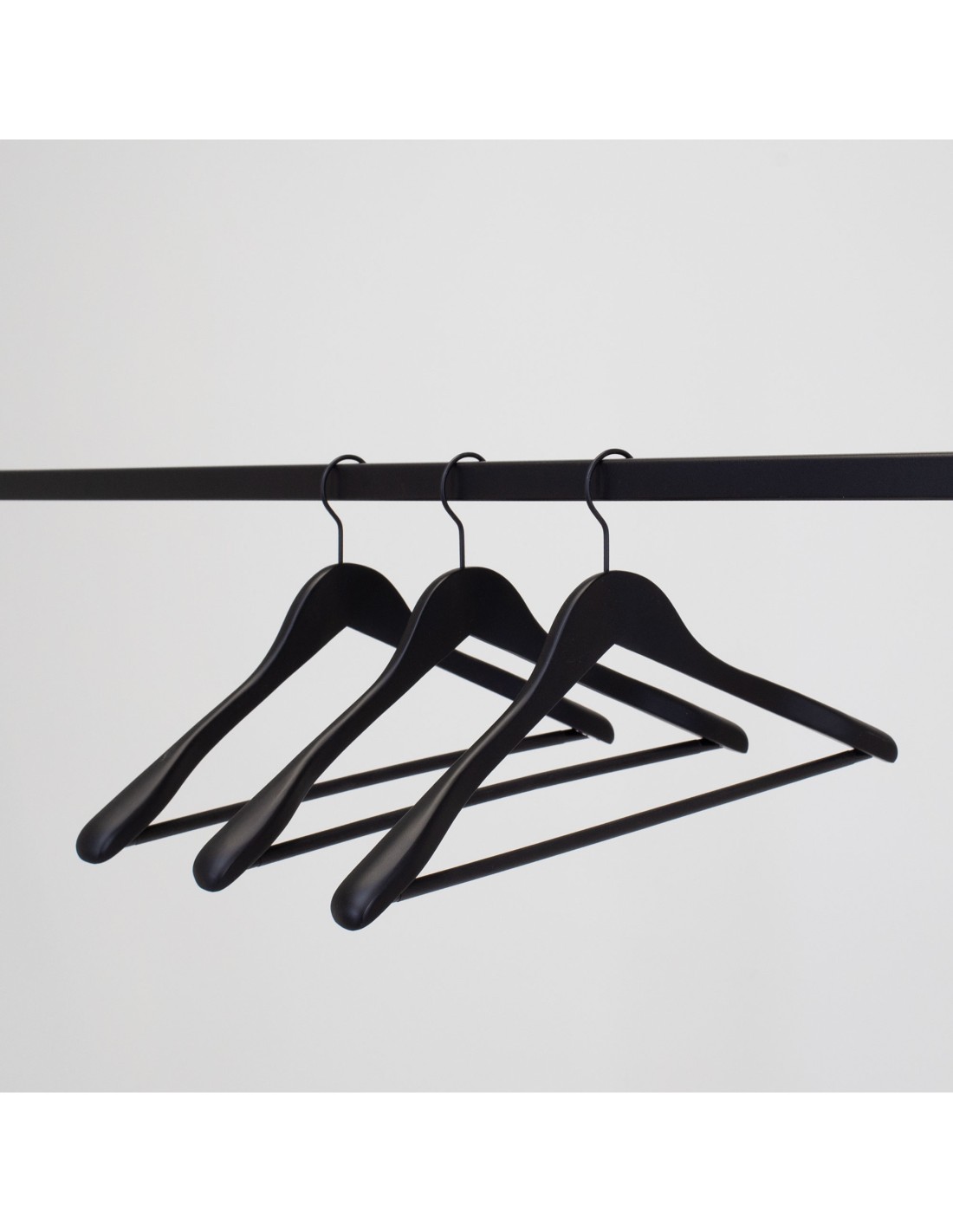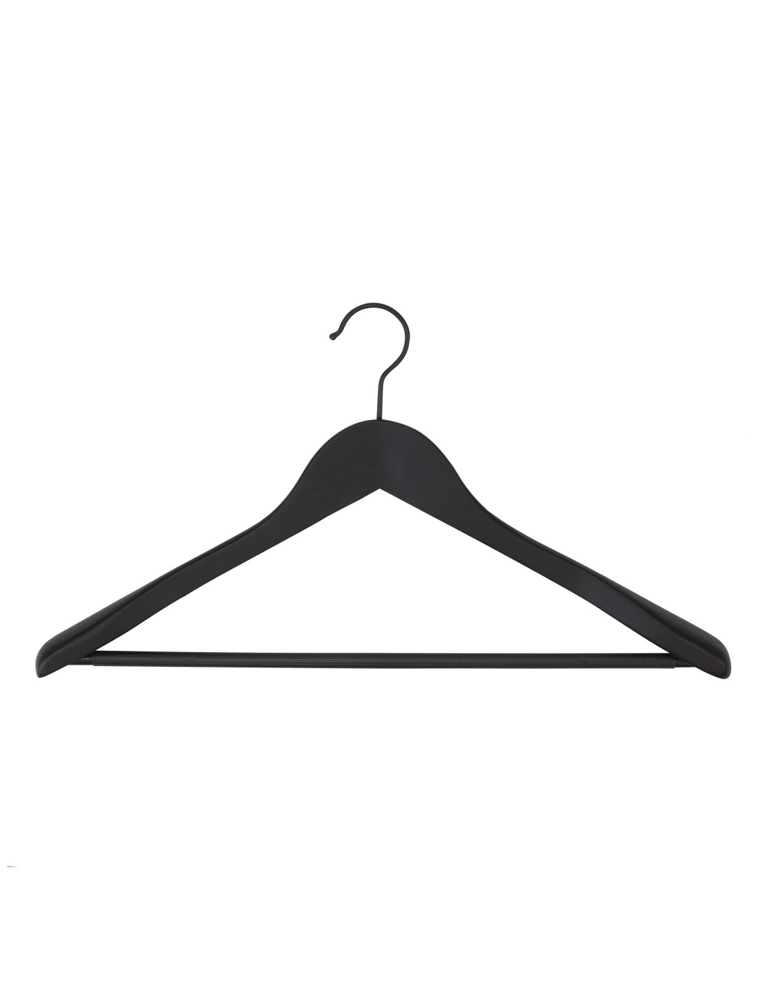 | Cintre en bois pour blazers, vestes et manteaux, légèrement galbé, avec barre antiglisse pour pantalons ou jupes, largeur 44 cm, largeur aux épaules 3 cm, bois de lotus finition soft touch noir, crochet noir - carton de 50 pcs |