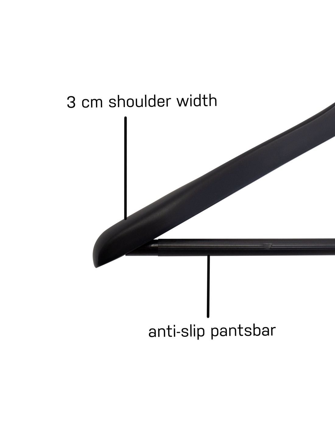 Cintre soft touch noir, barre antiglisse pour pantalons, 44 cm, crochet noir