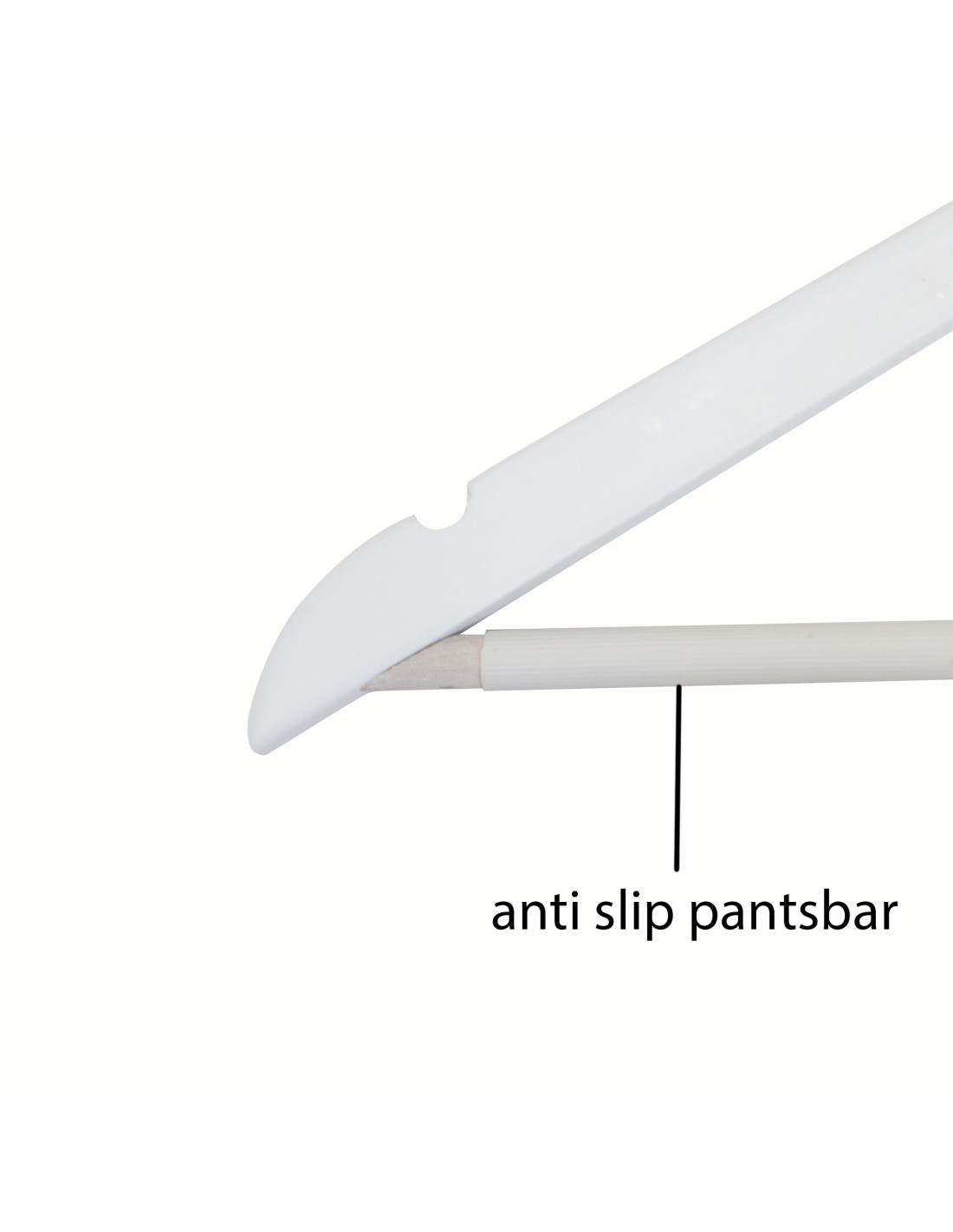 | Cintre légèrement galbé avec encoches et barre antiglisse pour pantalons, largeur 44 cm, bois de lotus, finition blanc mat, crochet en nickel - carton de 100 pcs |