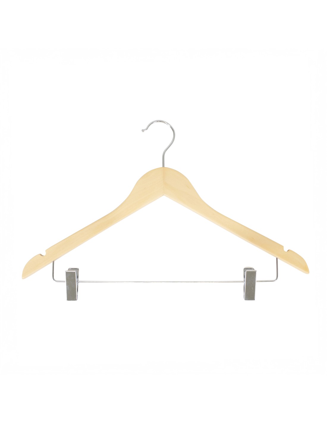 | Cintre légèrement galbé avec encoches et pinces, largeur 44 cm, bois de lotus, finition protective vernis transparent mat, pinces et crochet en chrome - carton de 100 pcs |
