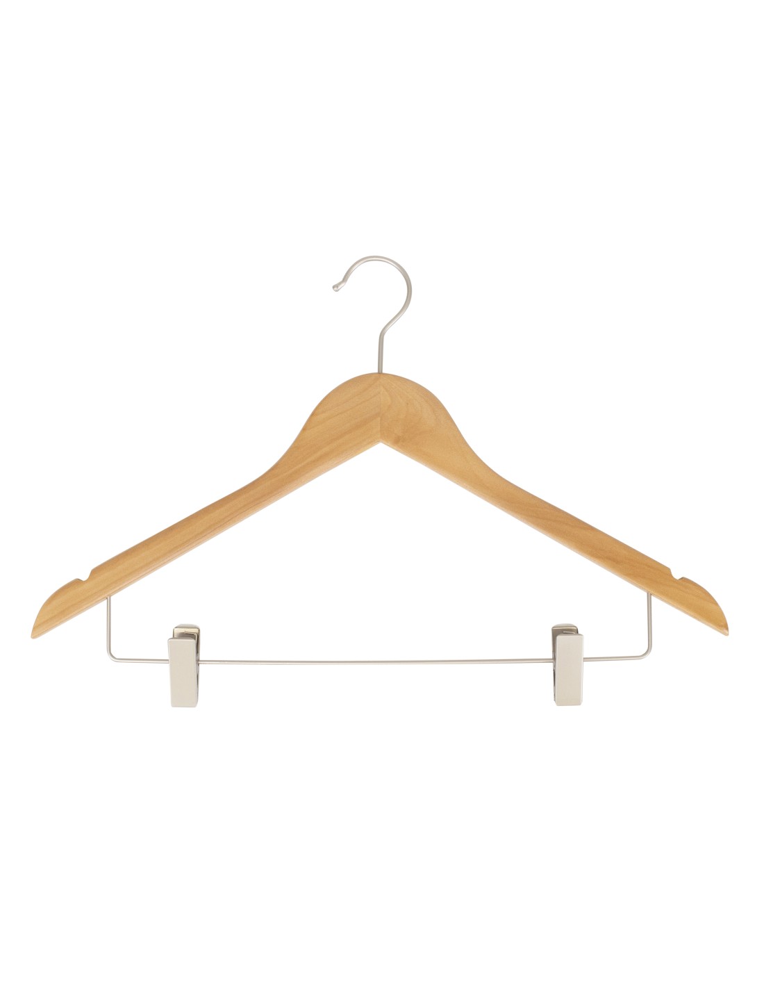 | Cintre légèrement galbé avec encoches et pinces, largeur 44 cm, bois de lotus, finition vernis transparent, pinces et crochet en nickel - carton de 100 pcs |