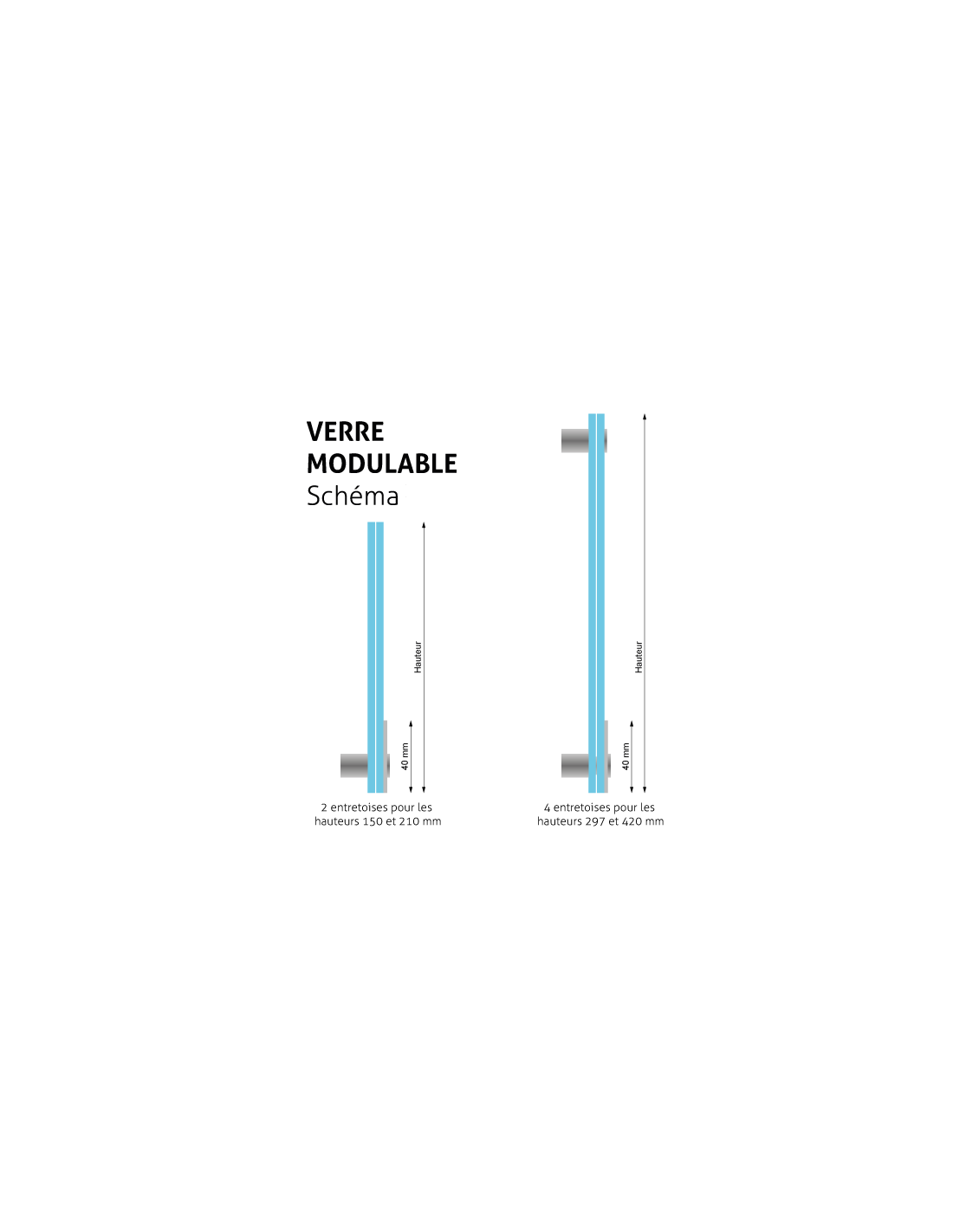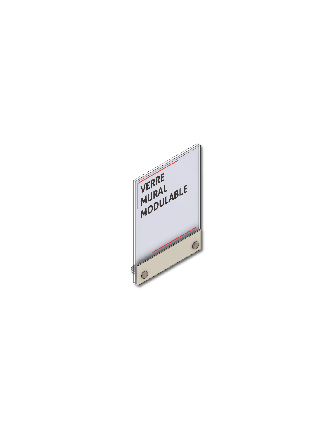 Le support est constitué de 2 plaques de verre d'épaisseur 4mm, d'une pièce modulable aluminium anodisé et de 2 ou 4 entretoises de fixation.